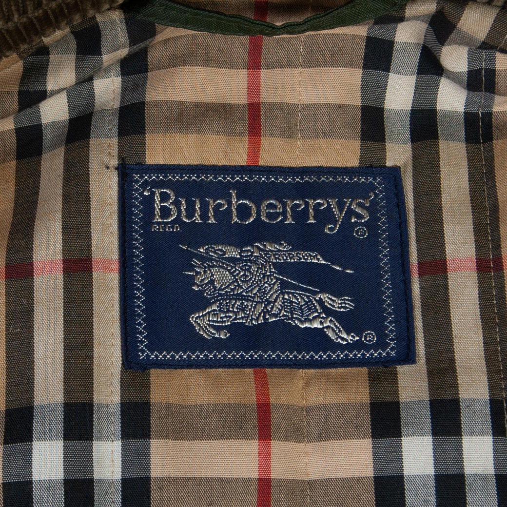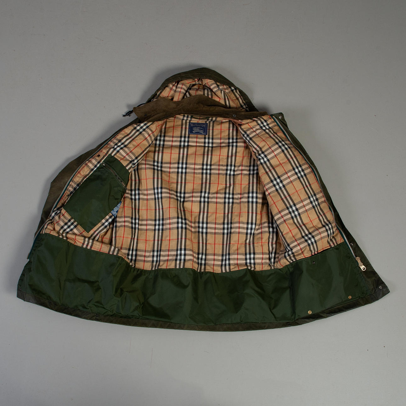 Grön oljerock från Burberry i storlek L Manchesterkrage, avtagbar kapuschong, foder i bomull och polyester.