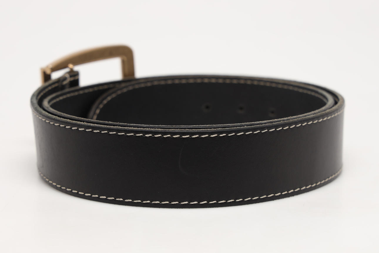 i svart läder med mässingspläterat spännini metall. Midjemått ca 95-105 cm. Bredd ca 4,3 cm.