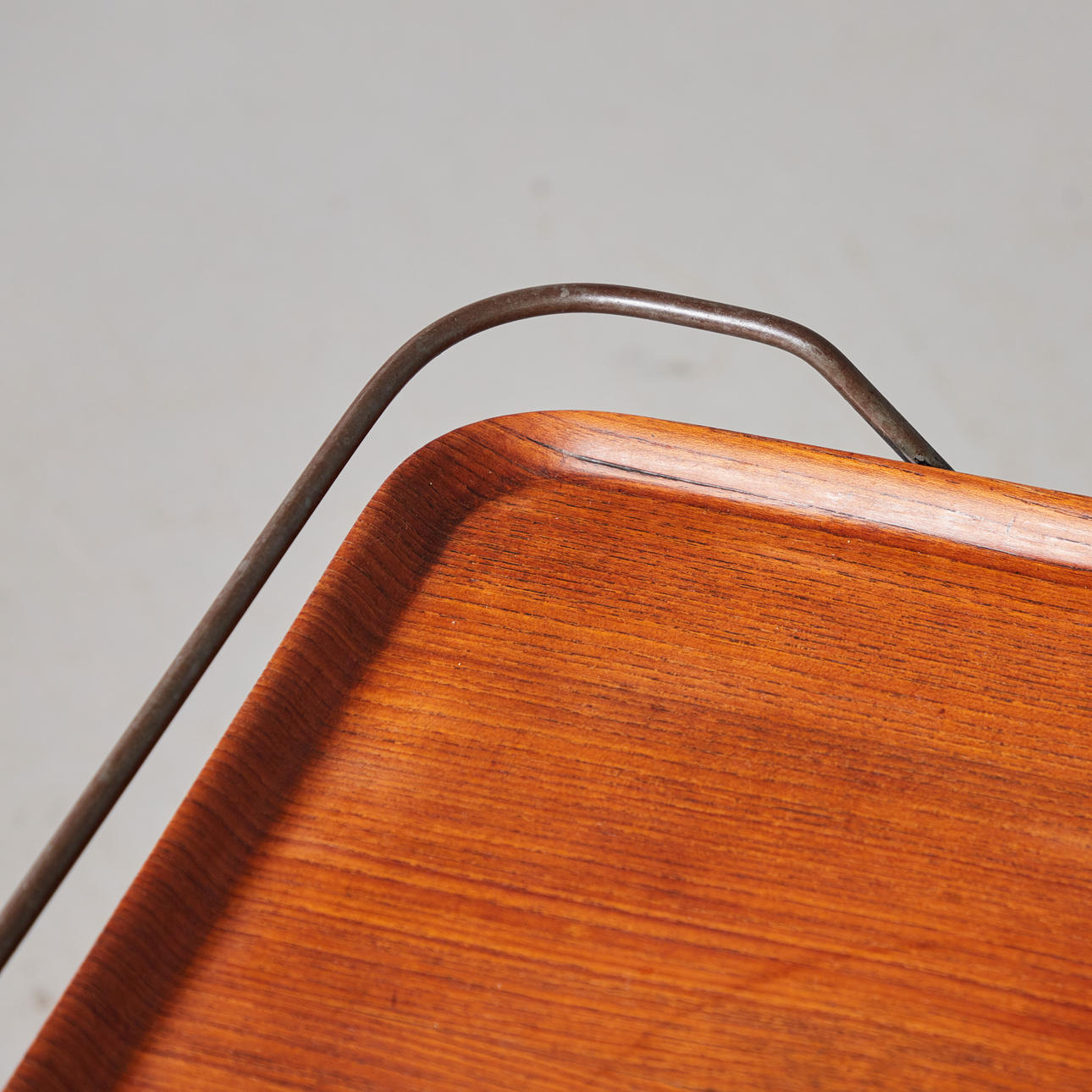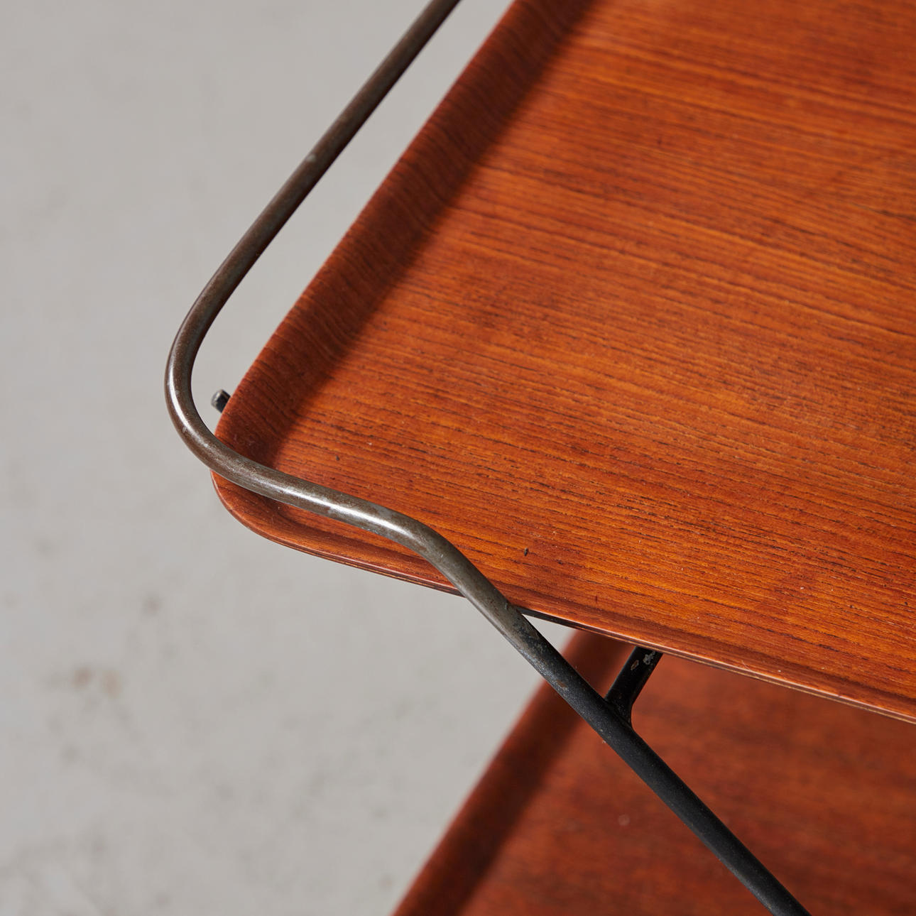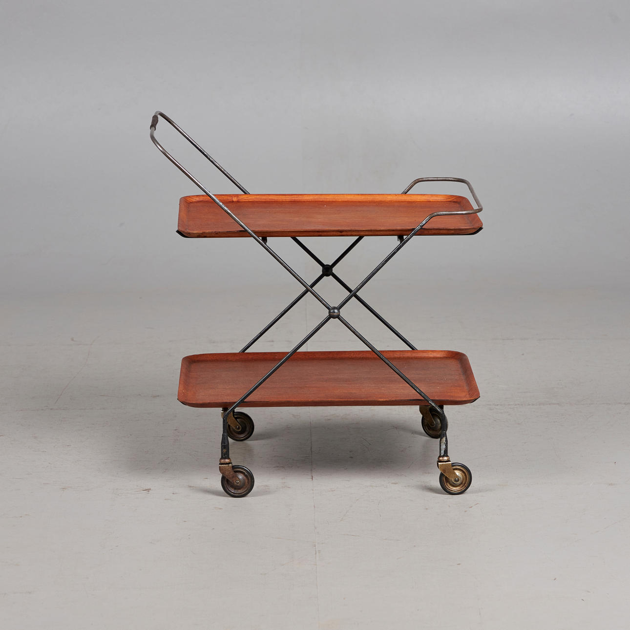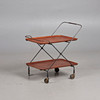 Serveringsvagnar/barvagnar, plywood, metall. Konstruktion bestående av en svartlackerad metallram och två avtagbara plywoodbrickor, utrustade med fyra rullar och ett handtag, H.70cm, L.60cm, W.45cm.