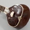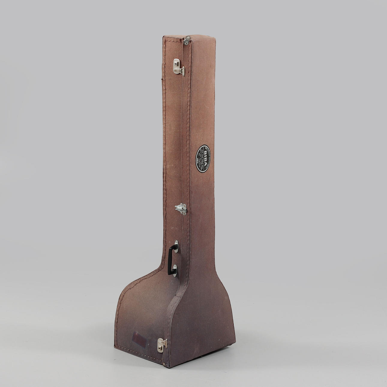 Trä, med inläggningar i ben. Höjd ca 123 cm. Case medföljer.