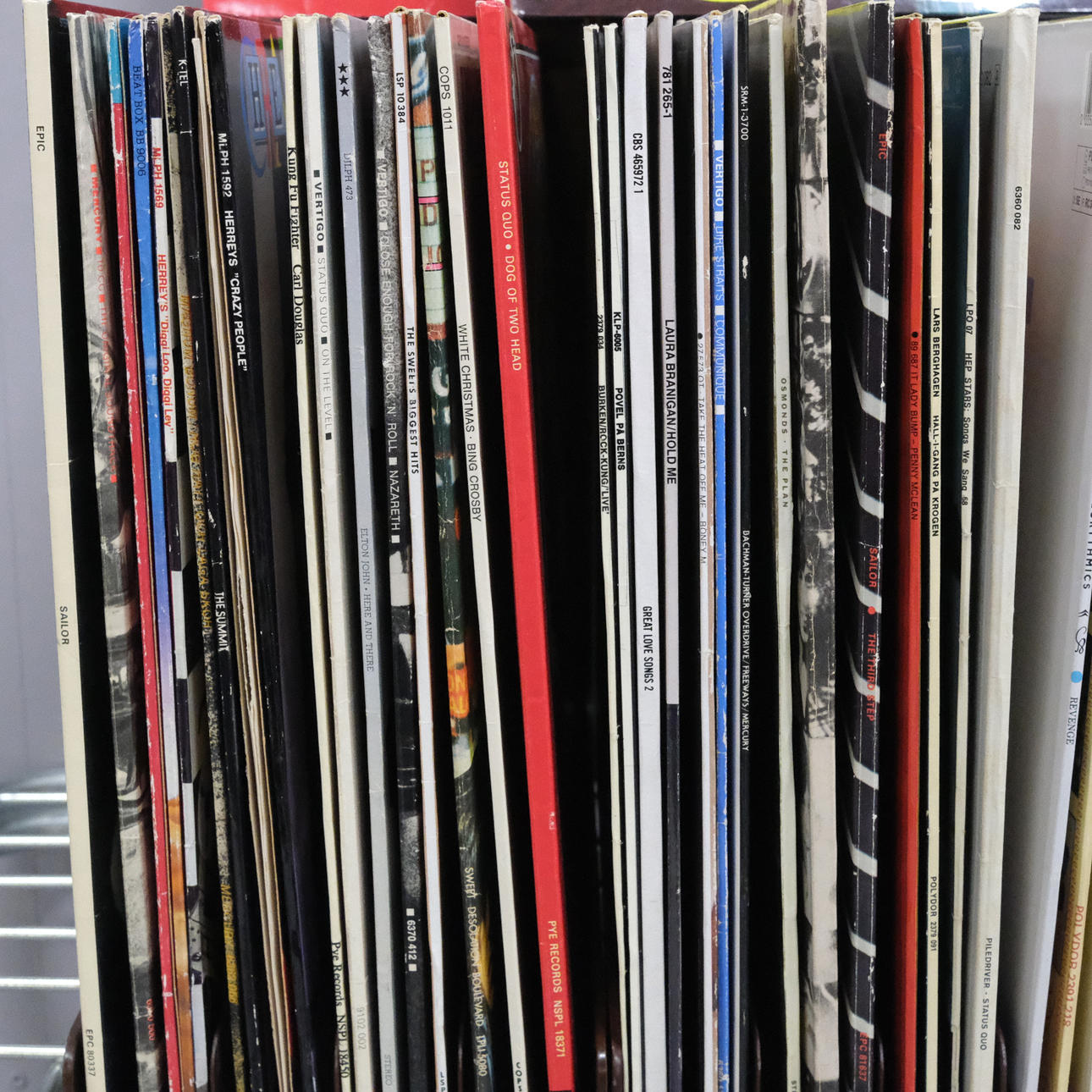 61 stycken LP skivor, bl.a, Dire Straits, Rolling Stones, Slade, Elvis, Status Quo m.fl. samt 3 stycken Gustavsberg skivställ.