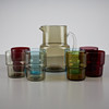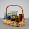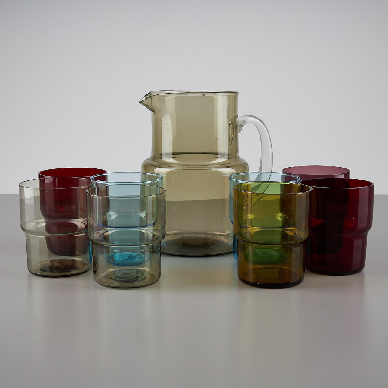 Åtta stapelbara glas med kanna. Videkorg med rottingshandtag. Höjd 27 cm, bredd 32 cm.