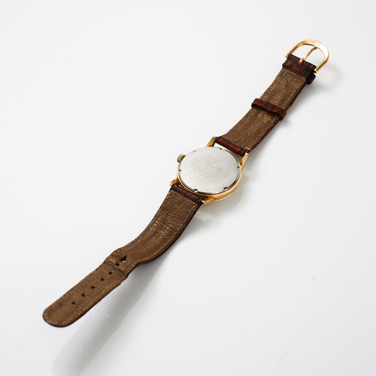 Manuell, plexiglas, boettnr. 135.012, cal 601, läderarmband med spänne i gulddoublé, diameter 32 mm.