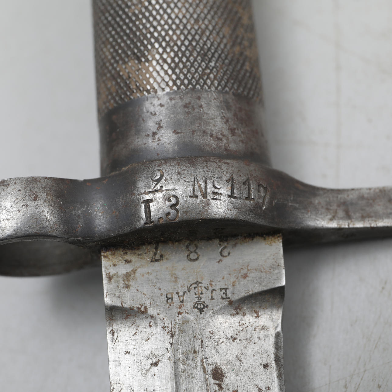 Bajonetten är tillverkad av EJAB i Eskilstuna och stämplad med deras krönta ankare.