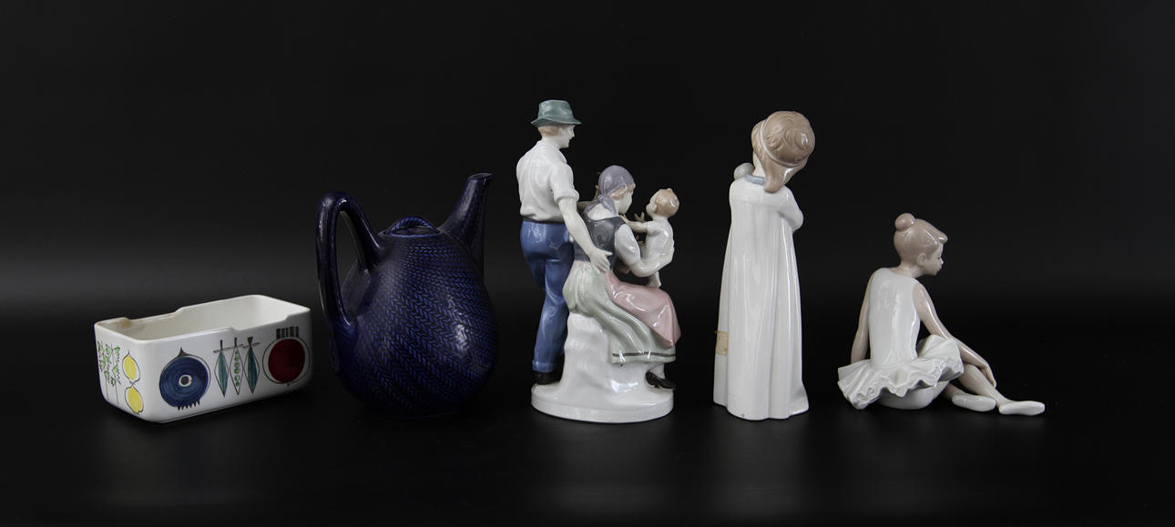 Kanna "Blå eld", 3 st porslinsfigurer, smörbytta "Picknick".