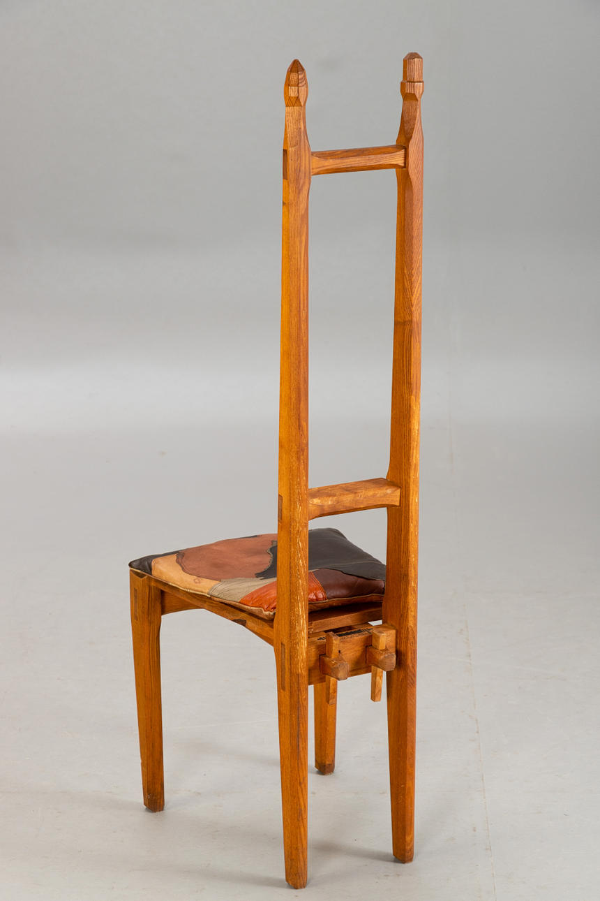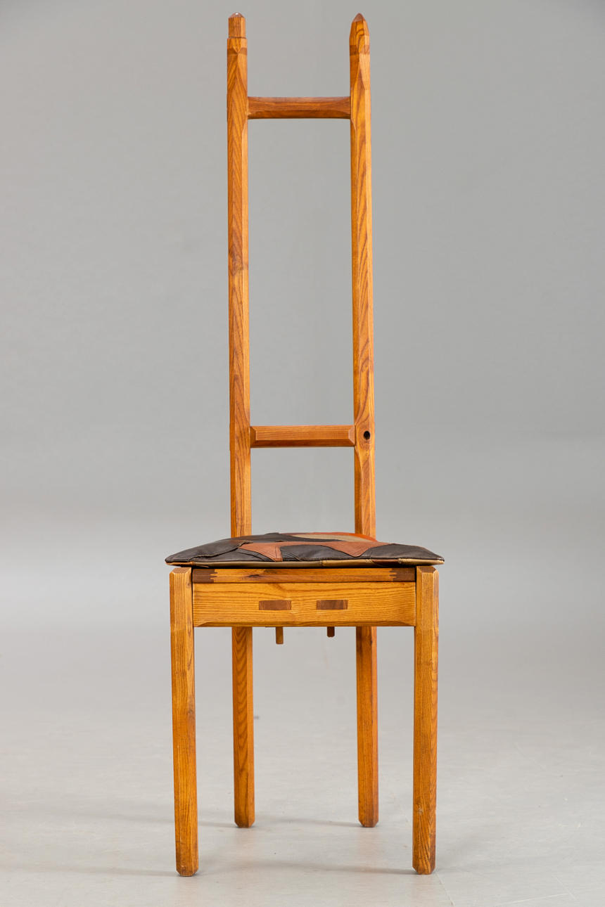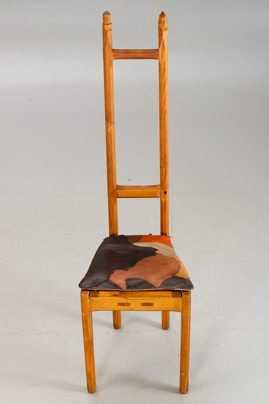 7 stolar med hög rygg alm trä Kan demonteras i 2 delar. Stolar numrerade i följd och märkta av tillverkaren 'Werkmöbel'. Patchwork sittdyna överdrag av olika färgat läder.
