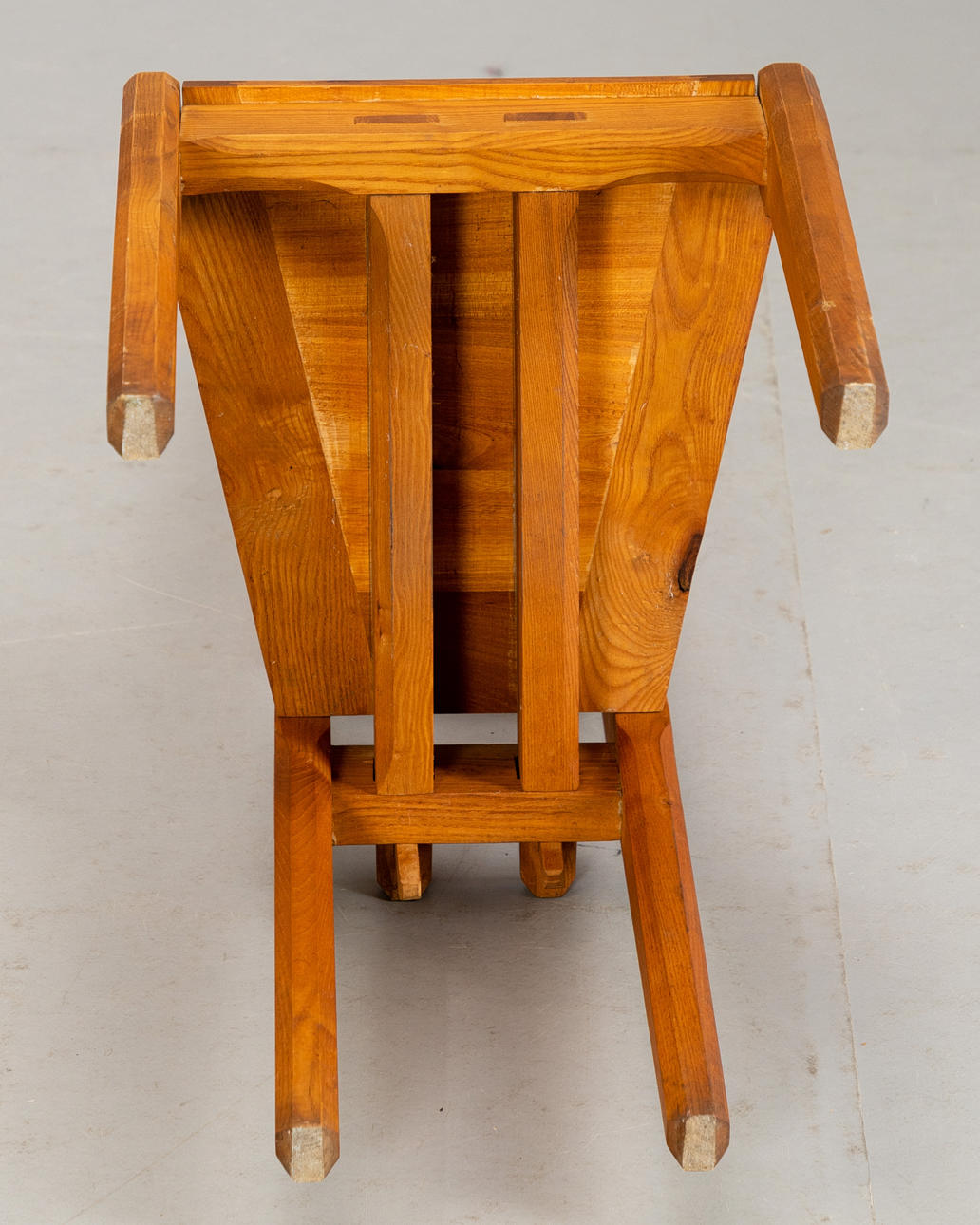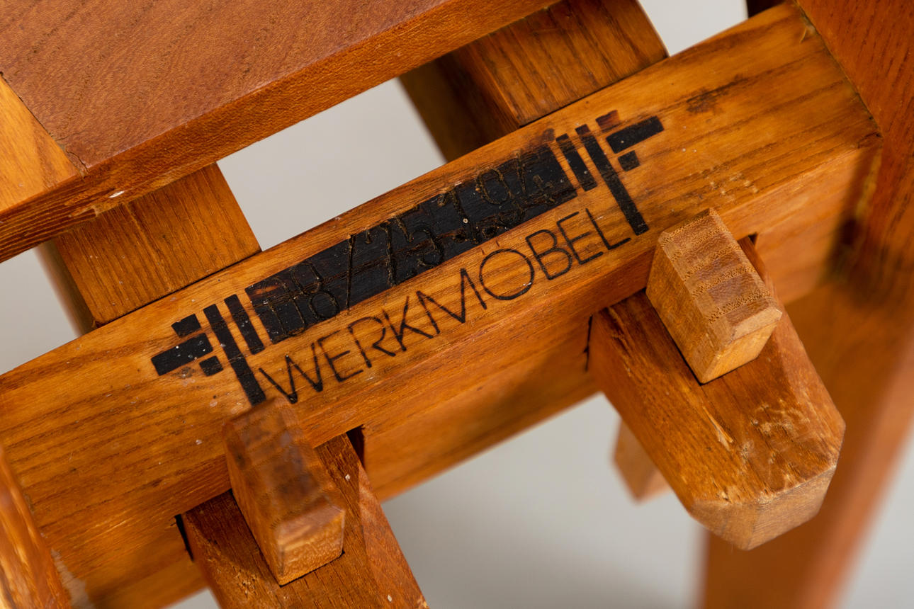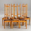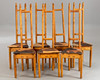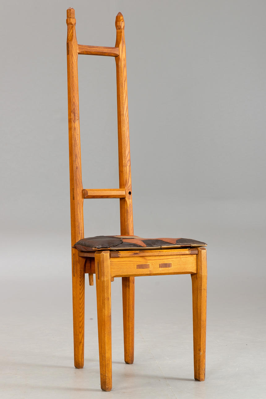 7 stolar med hög rygg alm trä Kan demonteras i 2 delar. Stolar numrerade i följd och märkta av tillverkaren 'Werkmöbel'. Patchwork sittdyna överdrag av olika färgat läder.