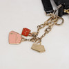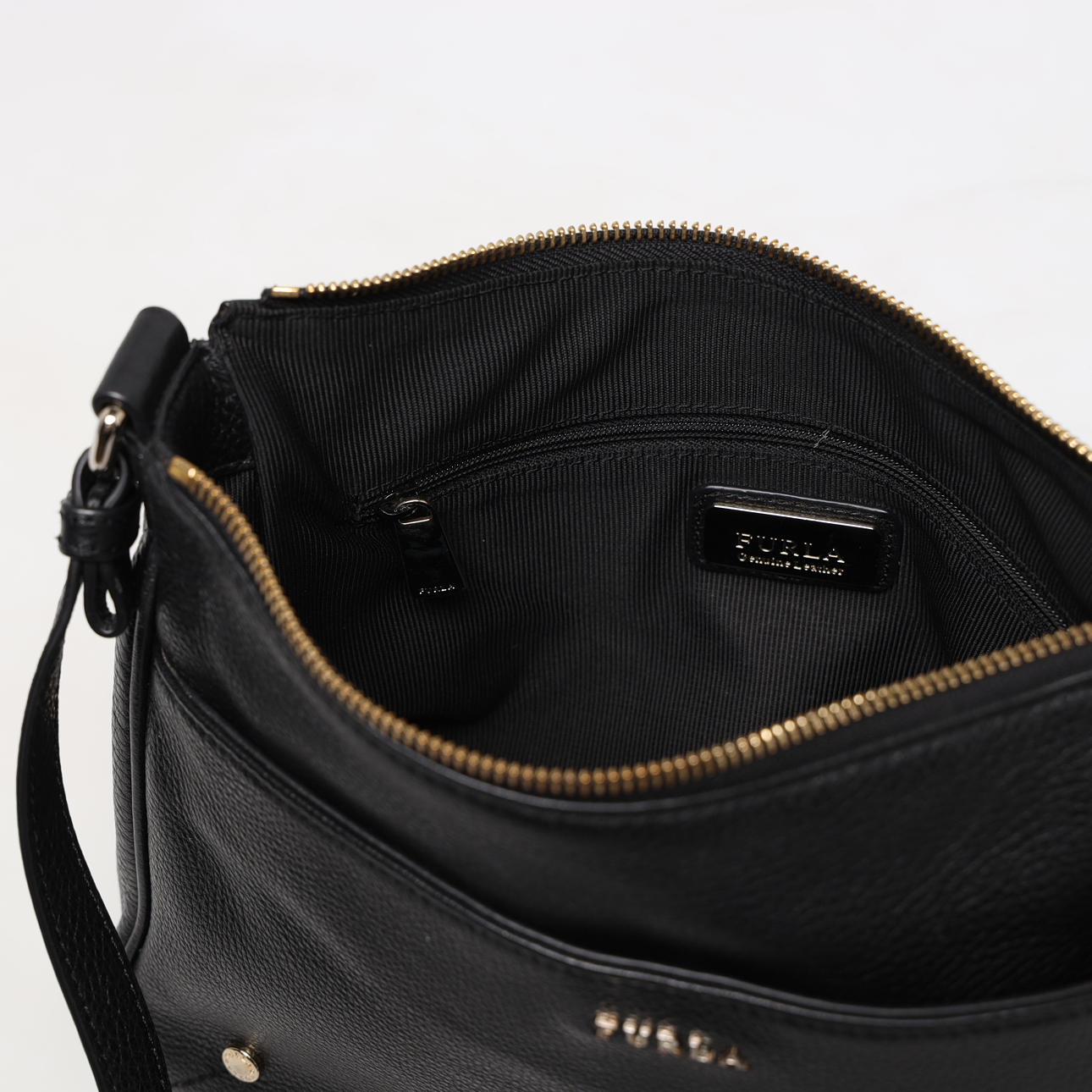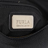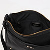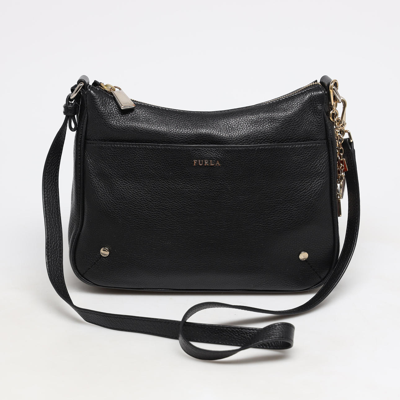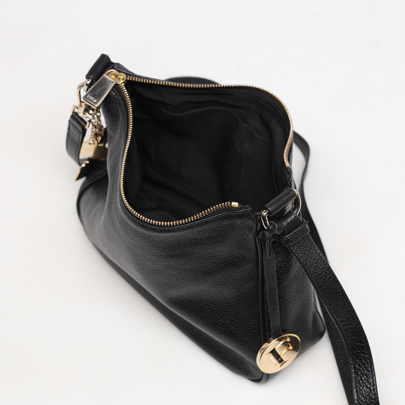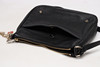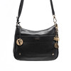 Axelremsväska i svart lammskinn, blixtlåsförsett huvudfack, ett mindre blixtlåsförsett myntfack. ett utanpåliggande fack. Avtagbara berlocker i gulmetall och emalj. Mått ca 22x26x8 cm.