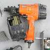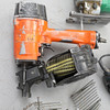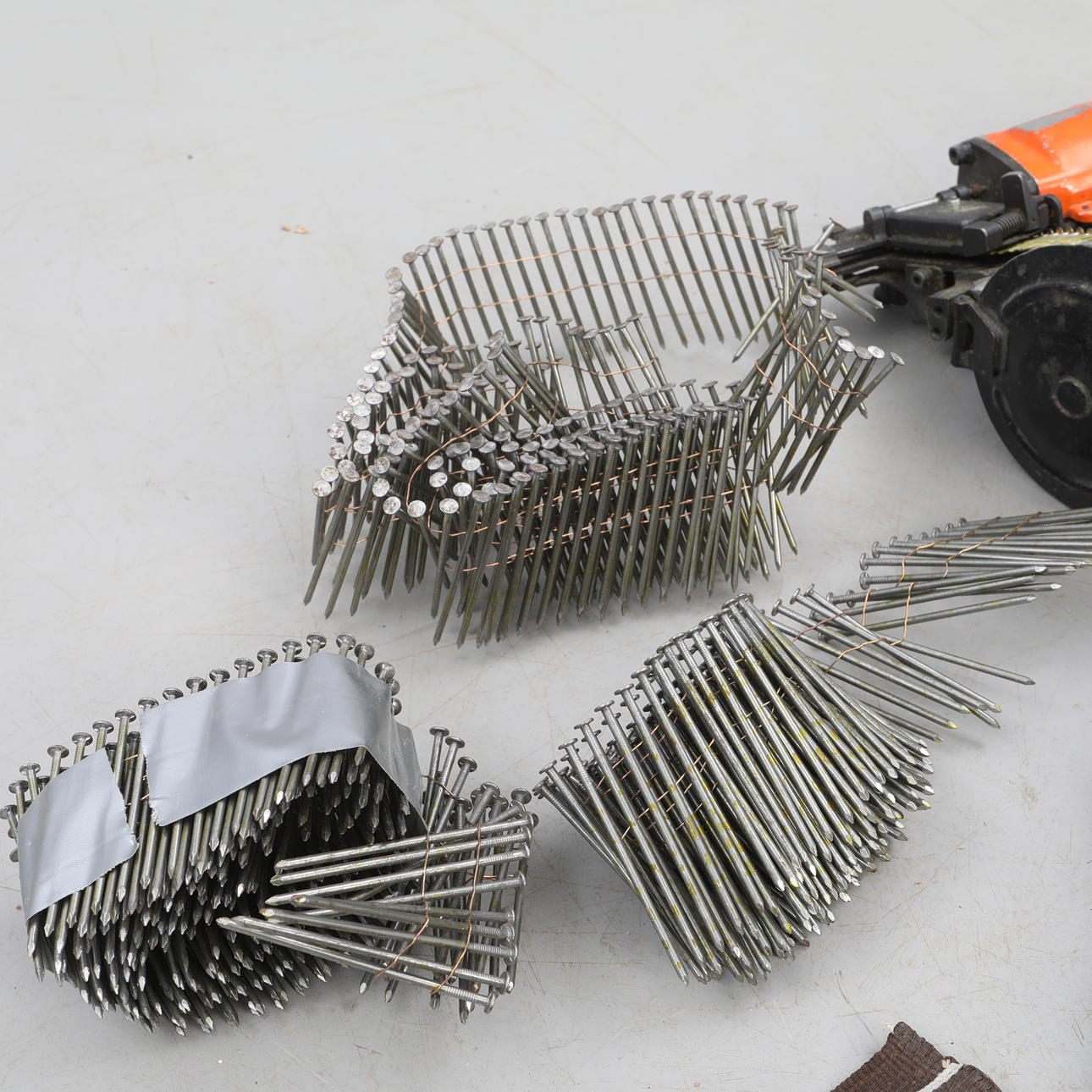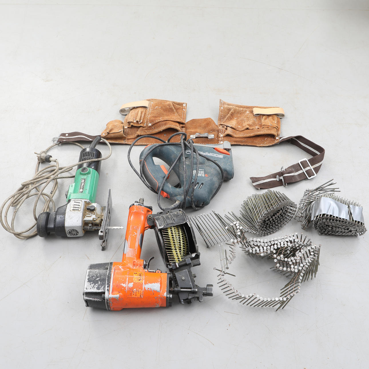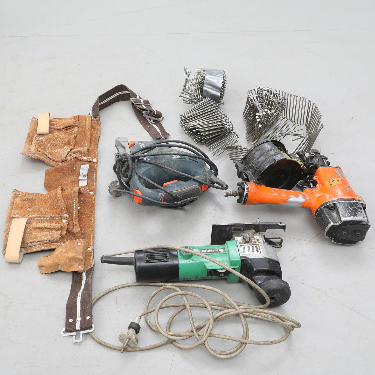 En st luftdriven spikpistol, okänt fabrikat med tillhörande spikar samt ett snickarbälte.