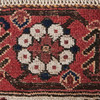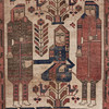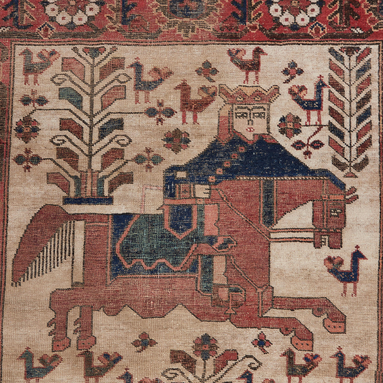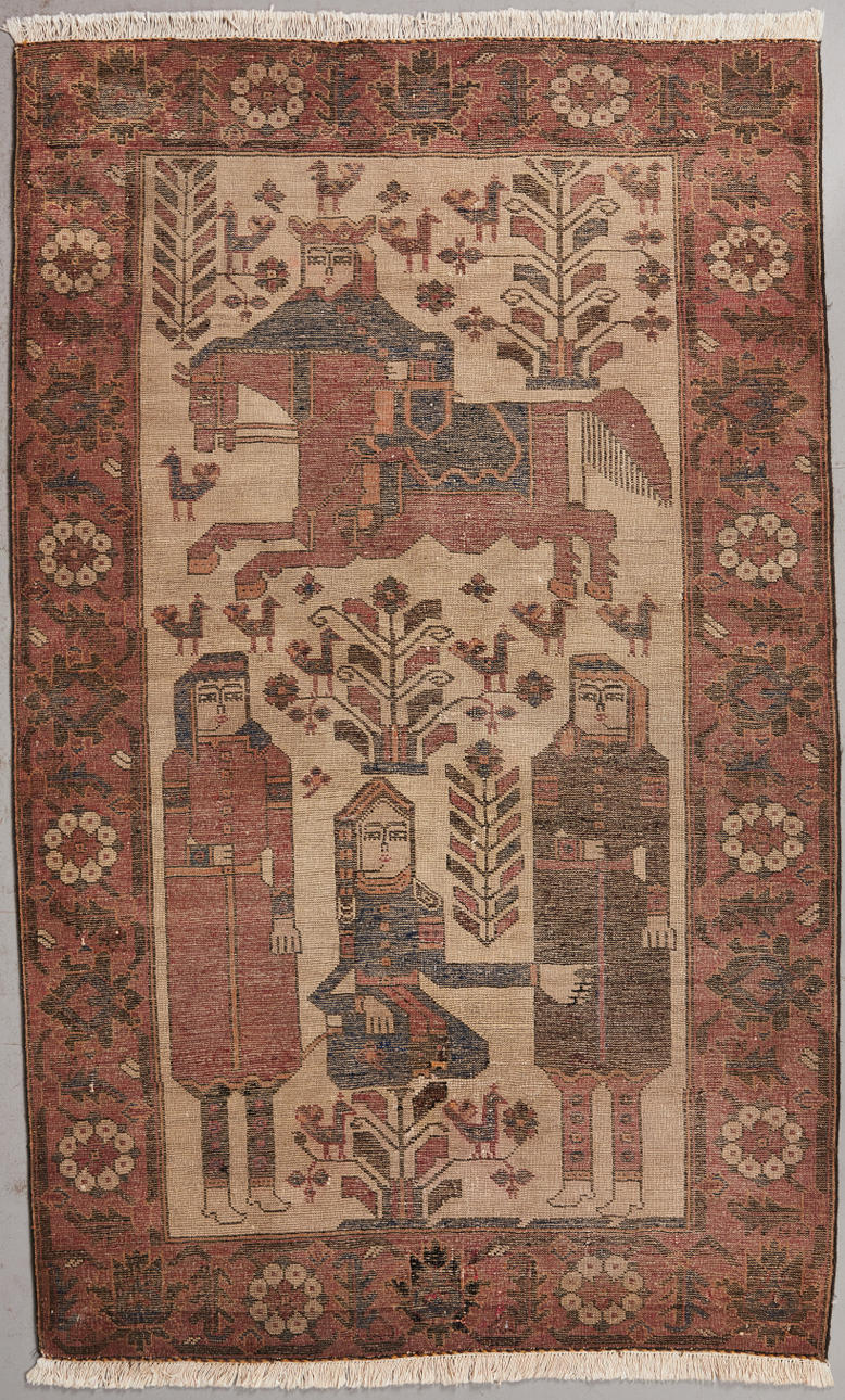 Matta/golvmatta, ull. Ullmatta med polykrom skildring av människor i medeltida kläder, en av dem sitter på en häst och stiliserade blommiga ornament på en röd bakgrund, kantad på sidan, L.190x115cm.