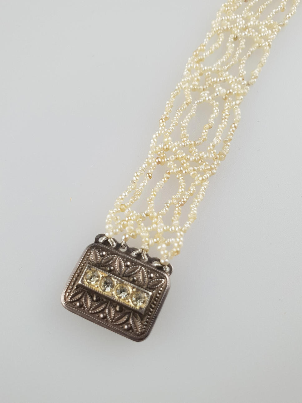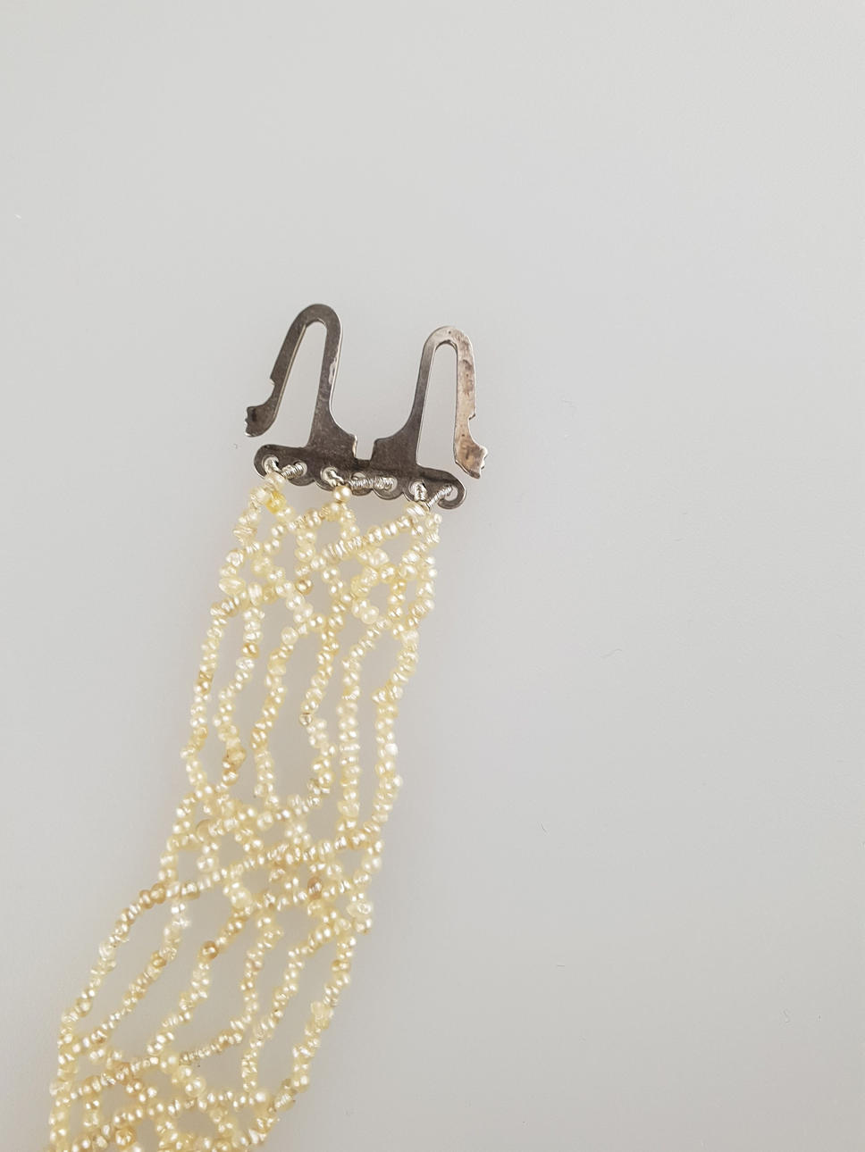 oregelbundna små naturliga järnpärlor, gängade i prydnadsmönster, några 6-strängade, stämplat silver 835 lås, ca 19,5x1,5 cm, stängning: ca 1,8 x 1,3 cm, vikt ca 6,9 g.