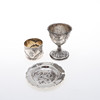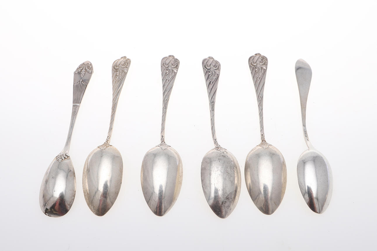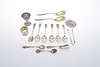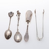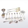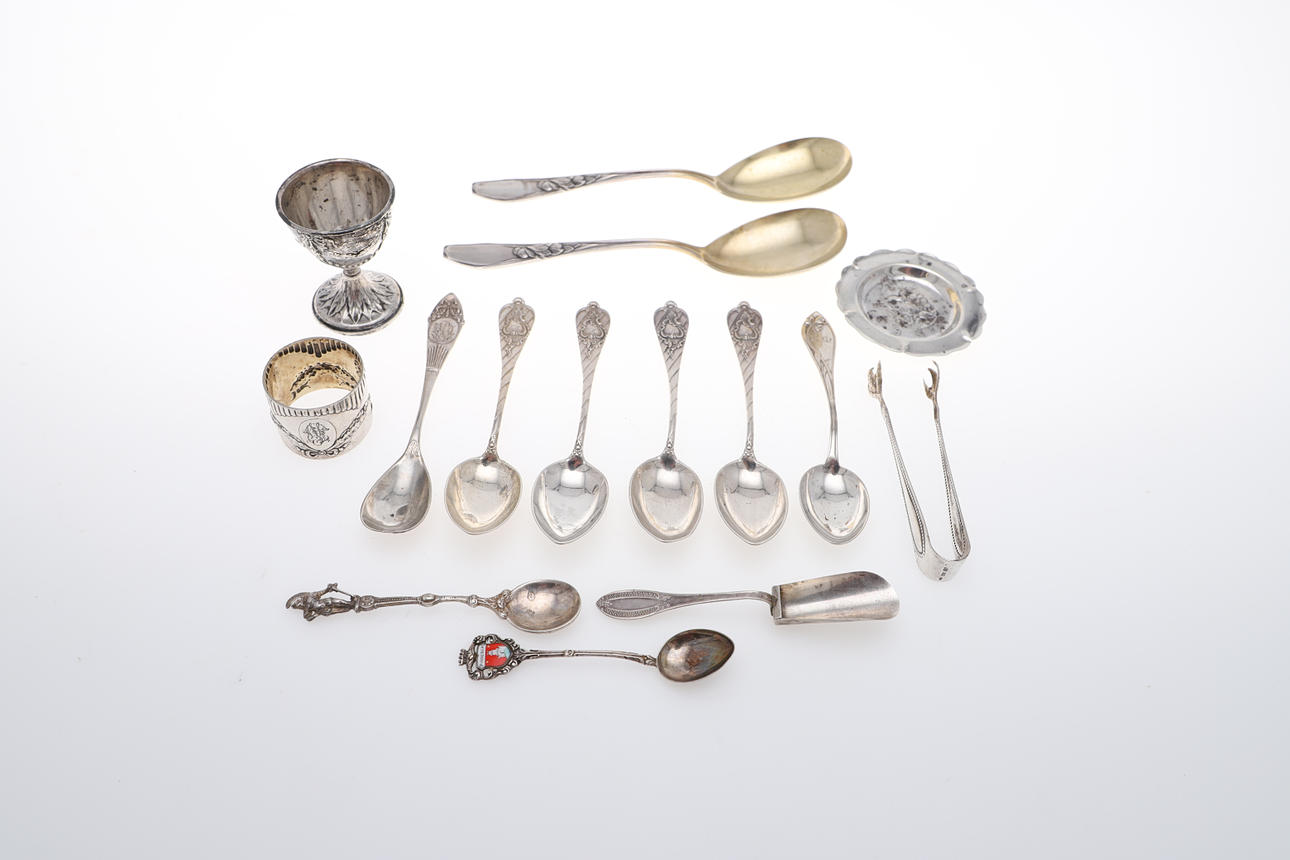 En blandad mängd tyskt silver, alla med olika mönster av blommor och pärlstav och andra. Föremålen inkluderar skedar, en äggkopp, servettring bland andra föremål. Total vikt 12 Ozt.