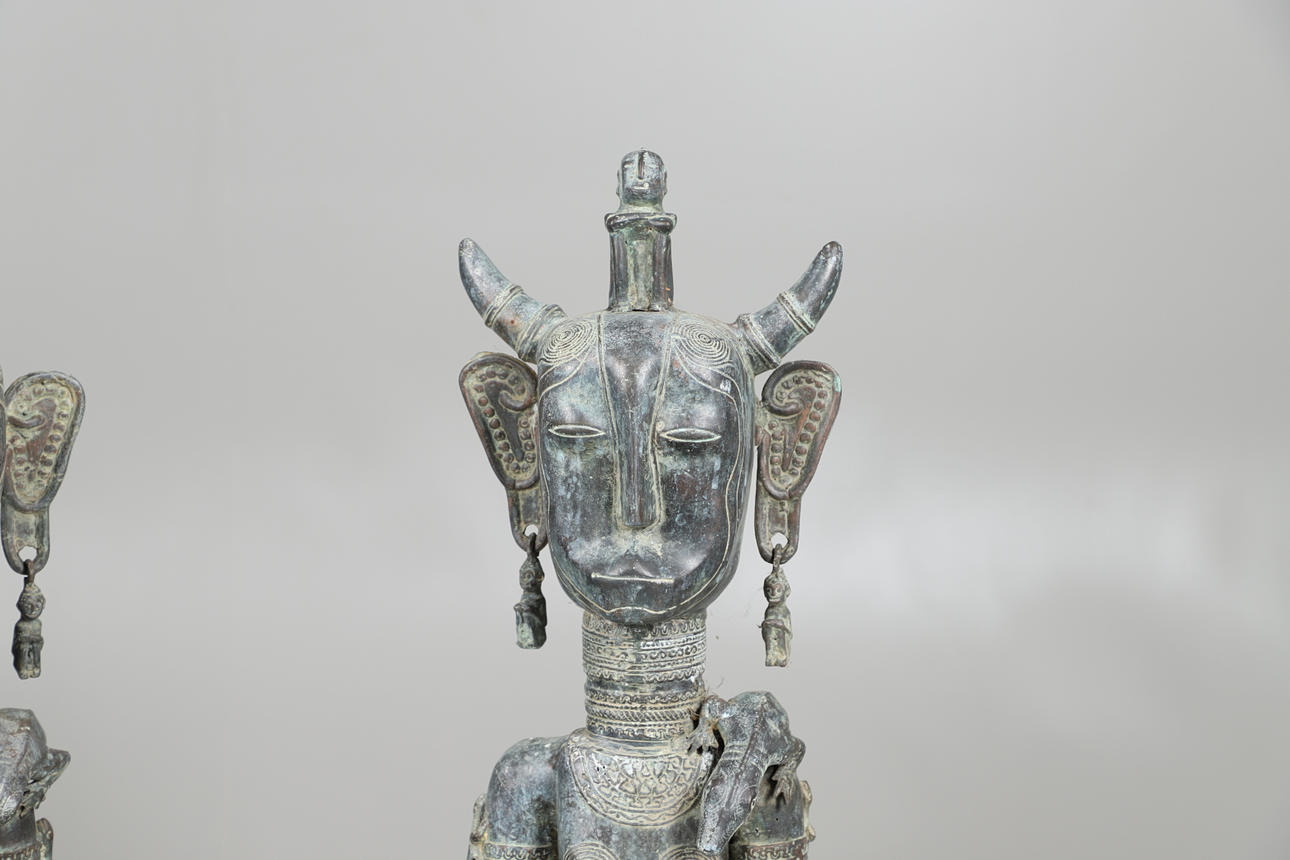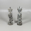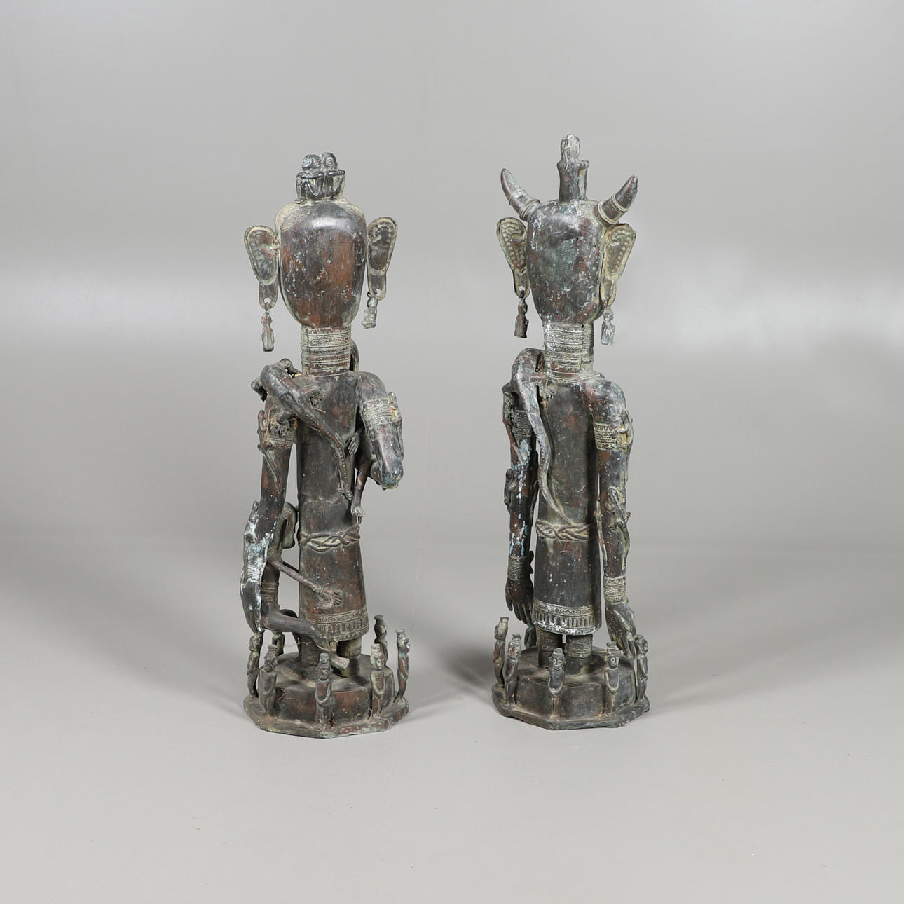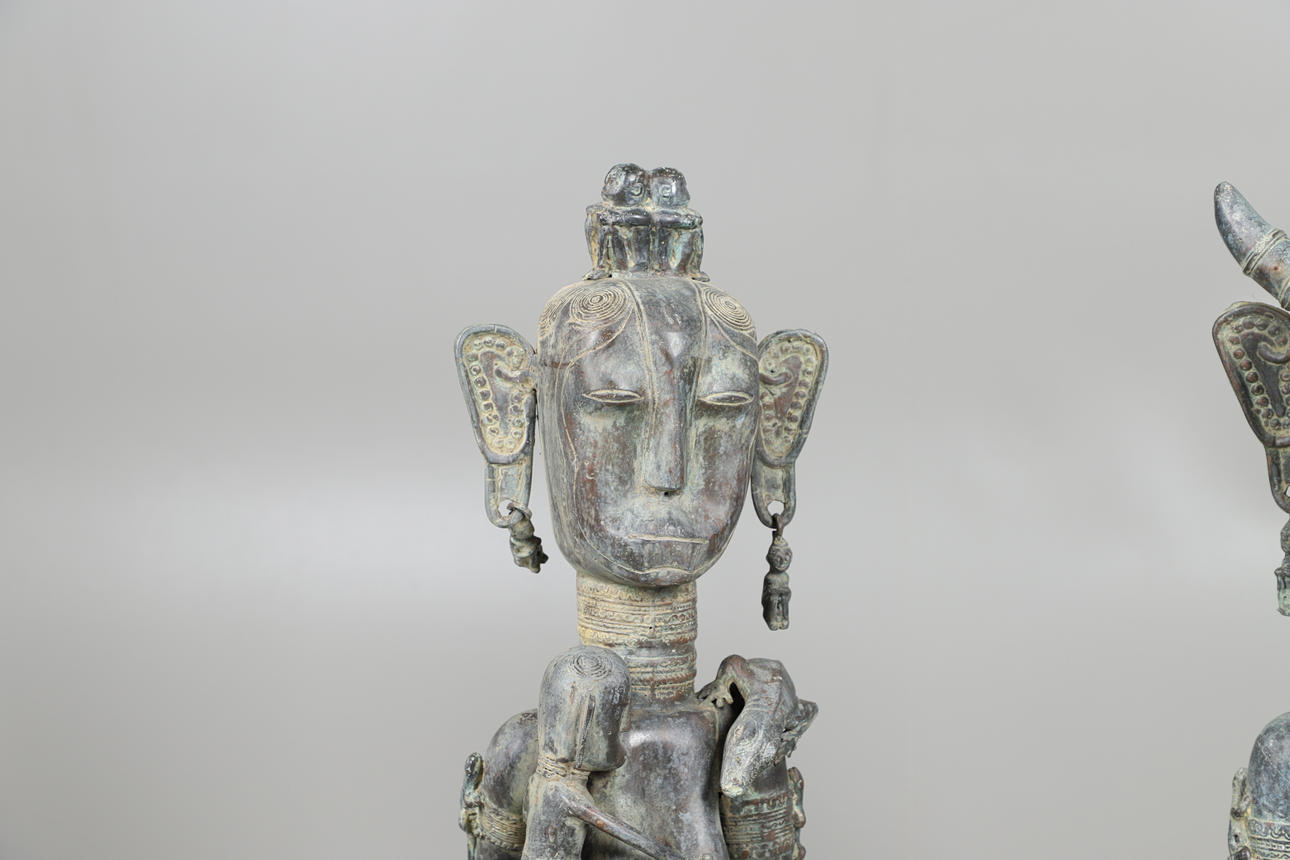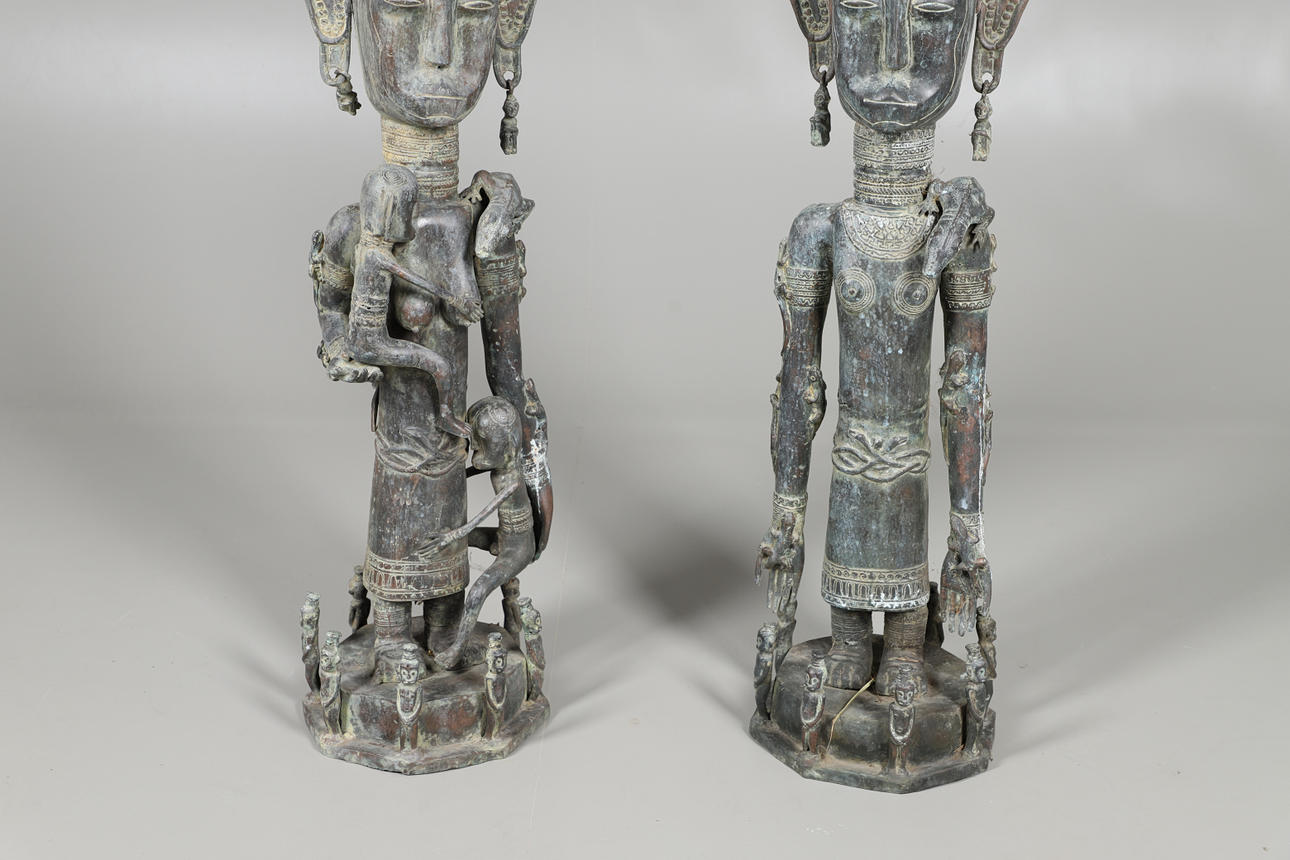 Eventuellt fertilitetsfigurer, var och en i tribal klänning med ödlor. Båda på åttkantiga baser, prydda med miniatyrfigurer. Höjd 92 cm.