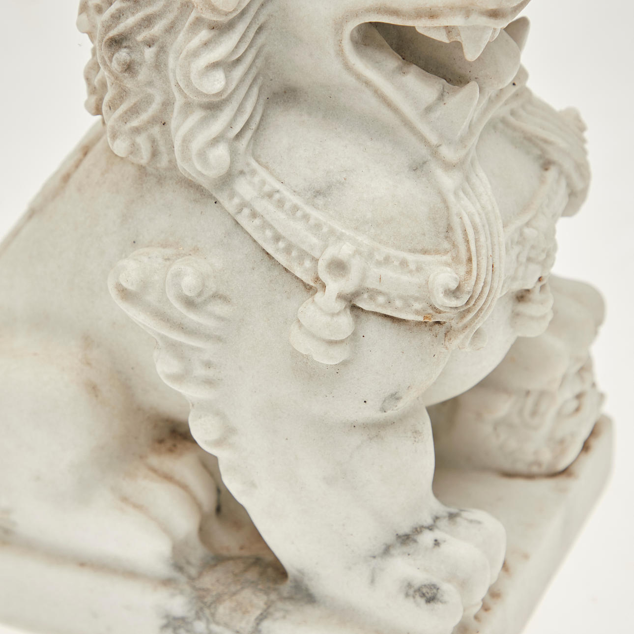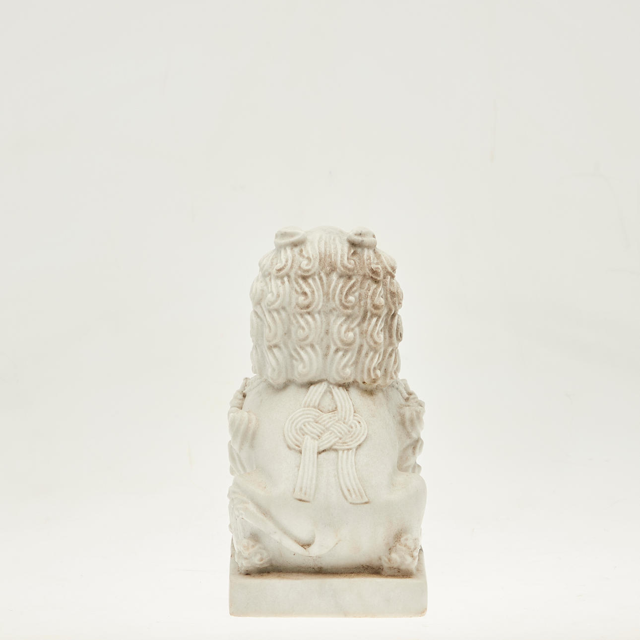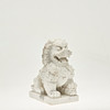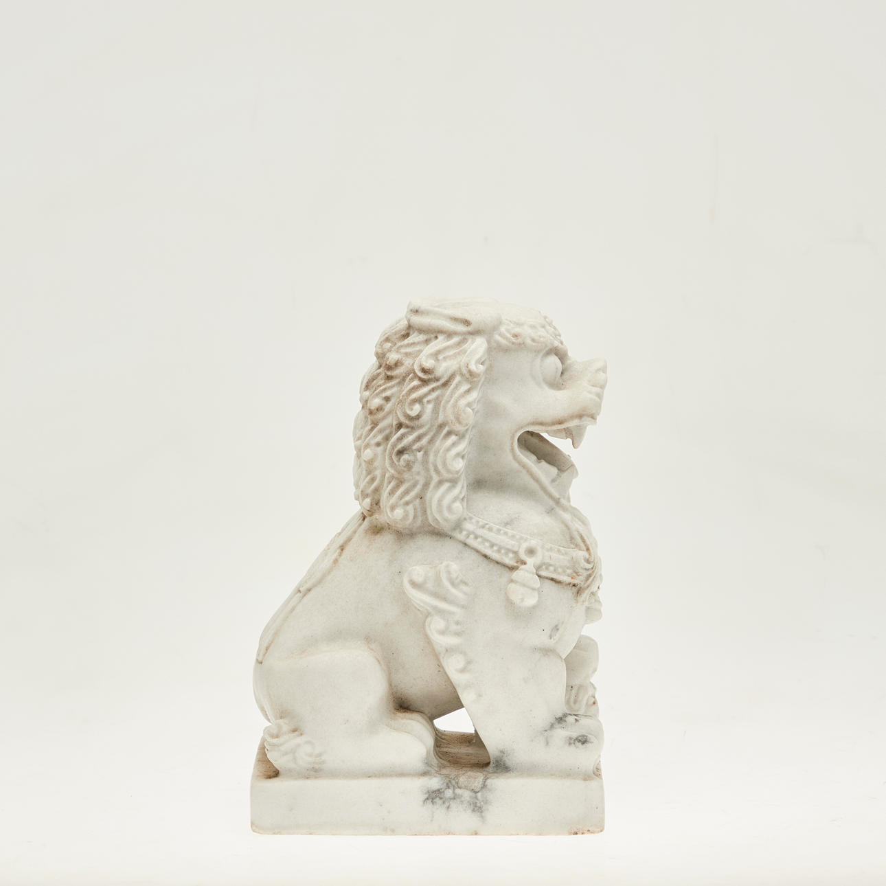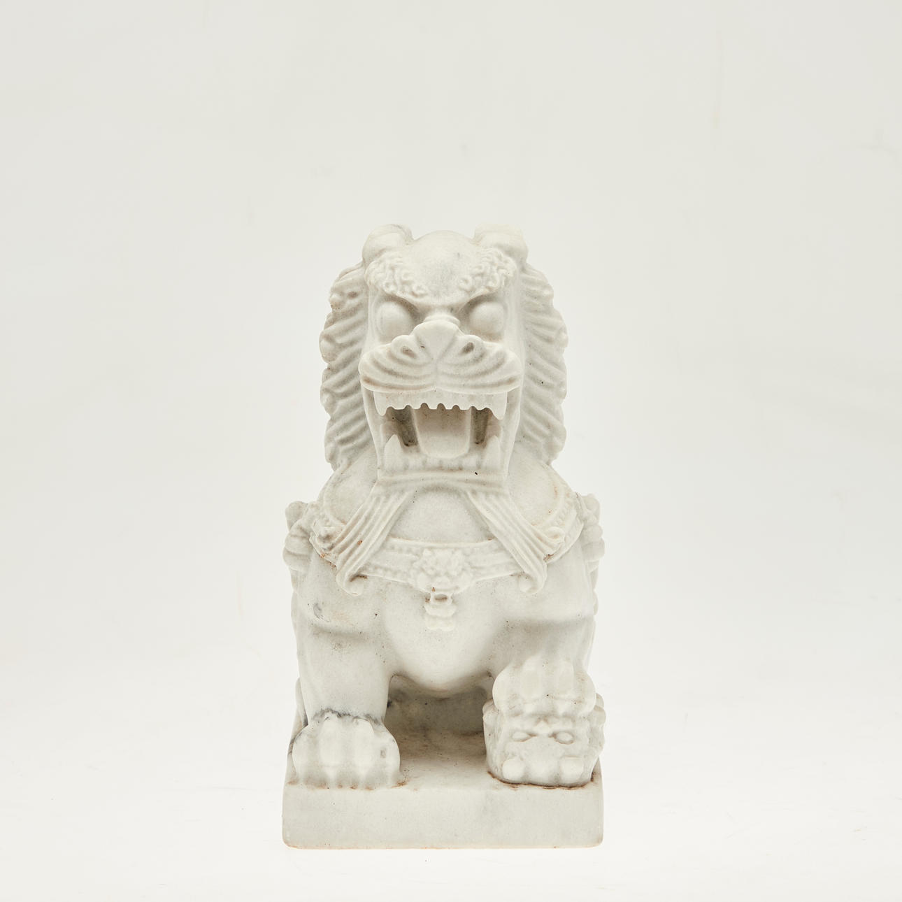 Skulptur/statyett, Fo hund, sten, Kina. Figur gjord av vit matt huggen sten som visar en kvinnlig skyddslejon i klassisk positionering med en främre tass vilande på en gröngöling, på en rektangulär sockel, H.29cm, L.19.5cm, 15,5 cm.