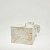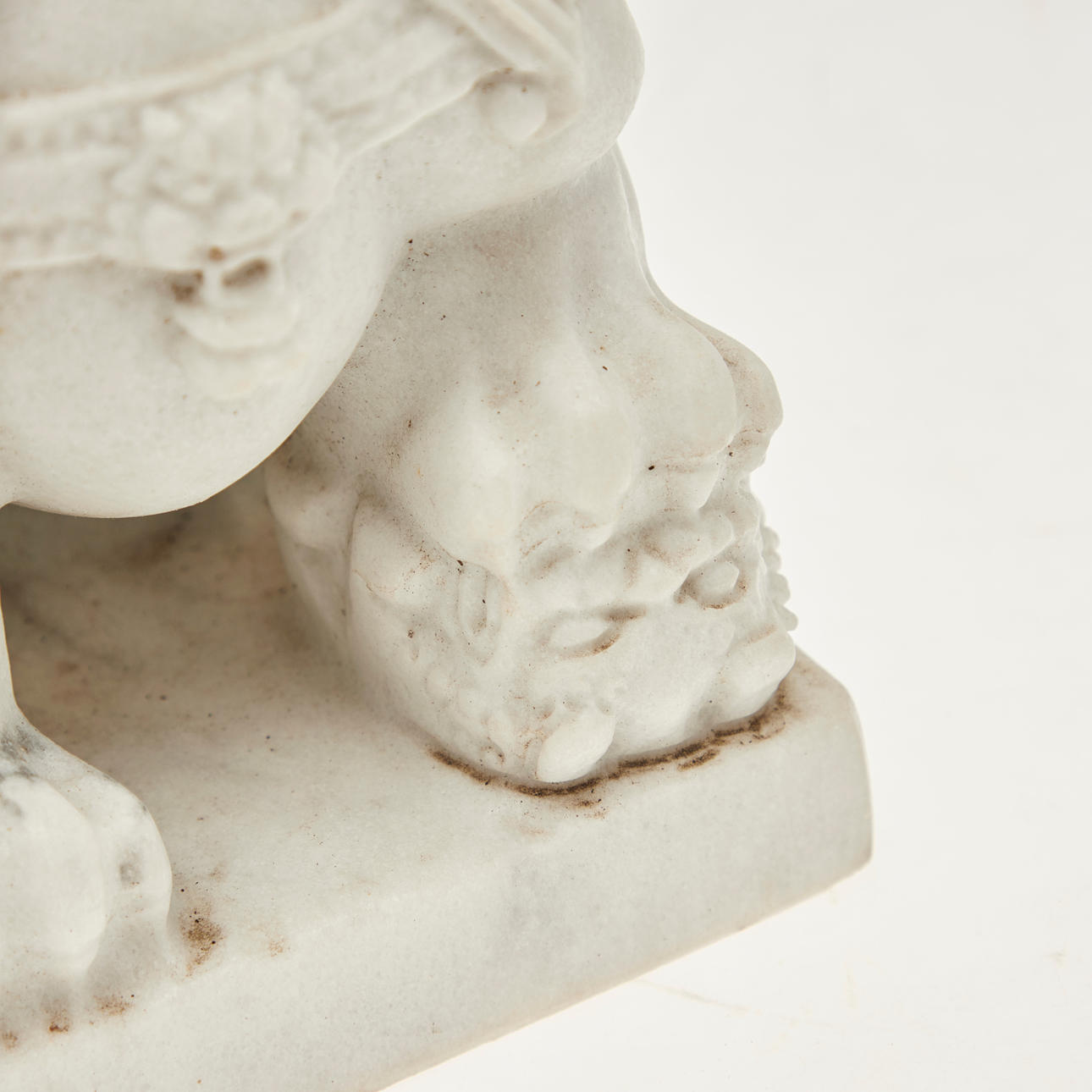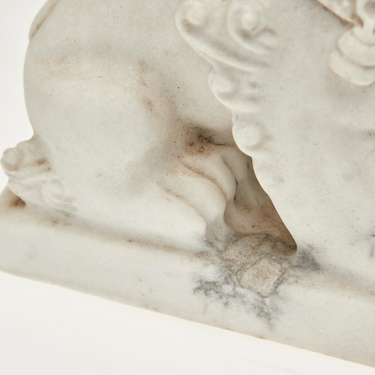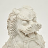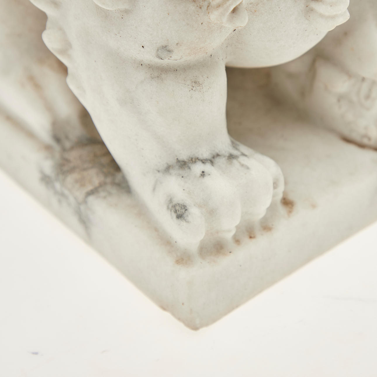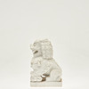 Skulptur/statyett, Fo hund, sten, Kina. Figur gjord av vit matt huggen sten som visar en kvinnlig skyddslejon i klassisk positionering med en främre tass vilande på en gröngöling, på en rektangulär sockel, H.29cm, L.19.5cm, 15,5 cm.