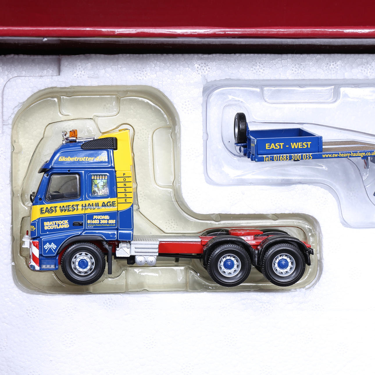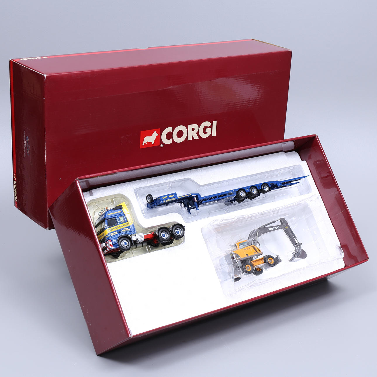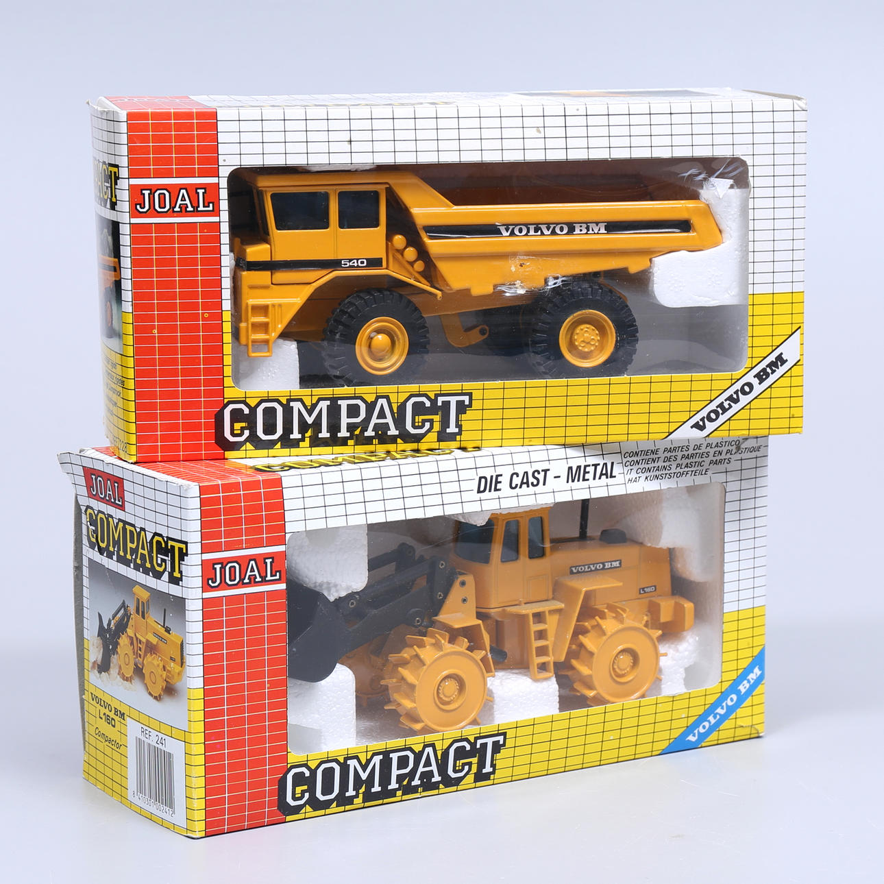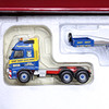 Dragbil med släp samt grävare, skala 1:50, Corgi. Dumper, skala 1:50, Joal compact. Hjullastare, skala 1:50, Joal compact.