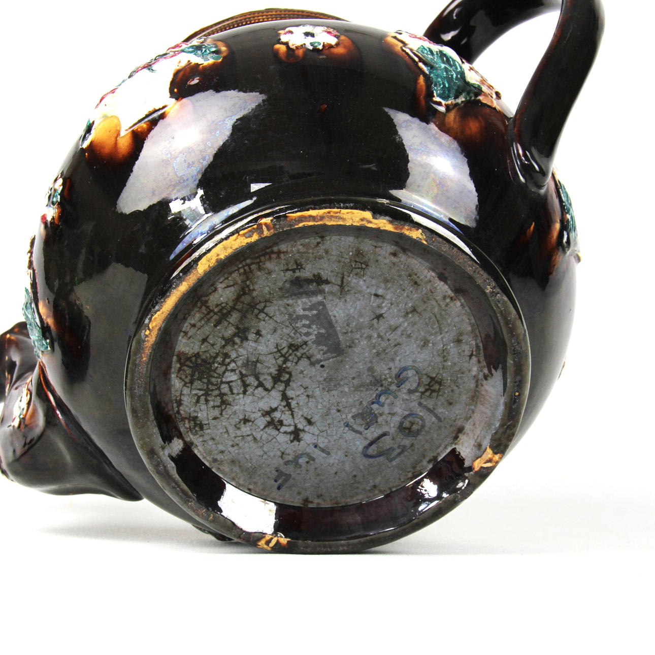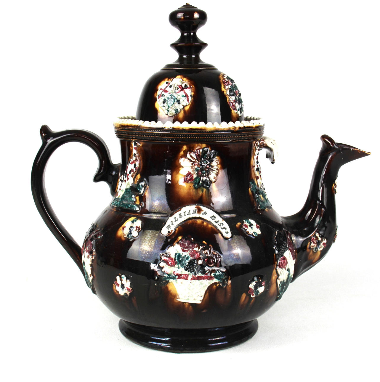 En stor Staffordshire glaserad keramik tekanna med ett 1876 imponerat datum, H. 37cm.