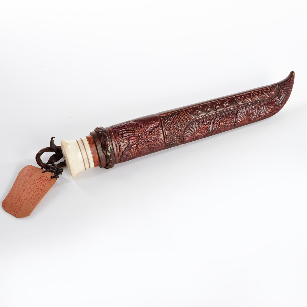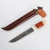 Skaft i renhorn och masurbjörk, balja i blindpressat läder, längd 36cm, bladet 21cm, signerat o daterat N.O. Wallin-20 resp. Eje.