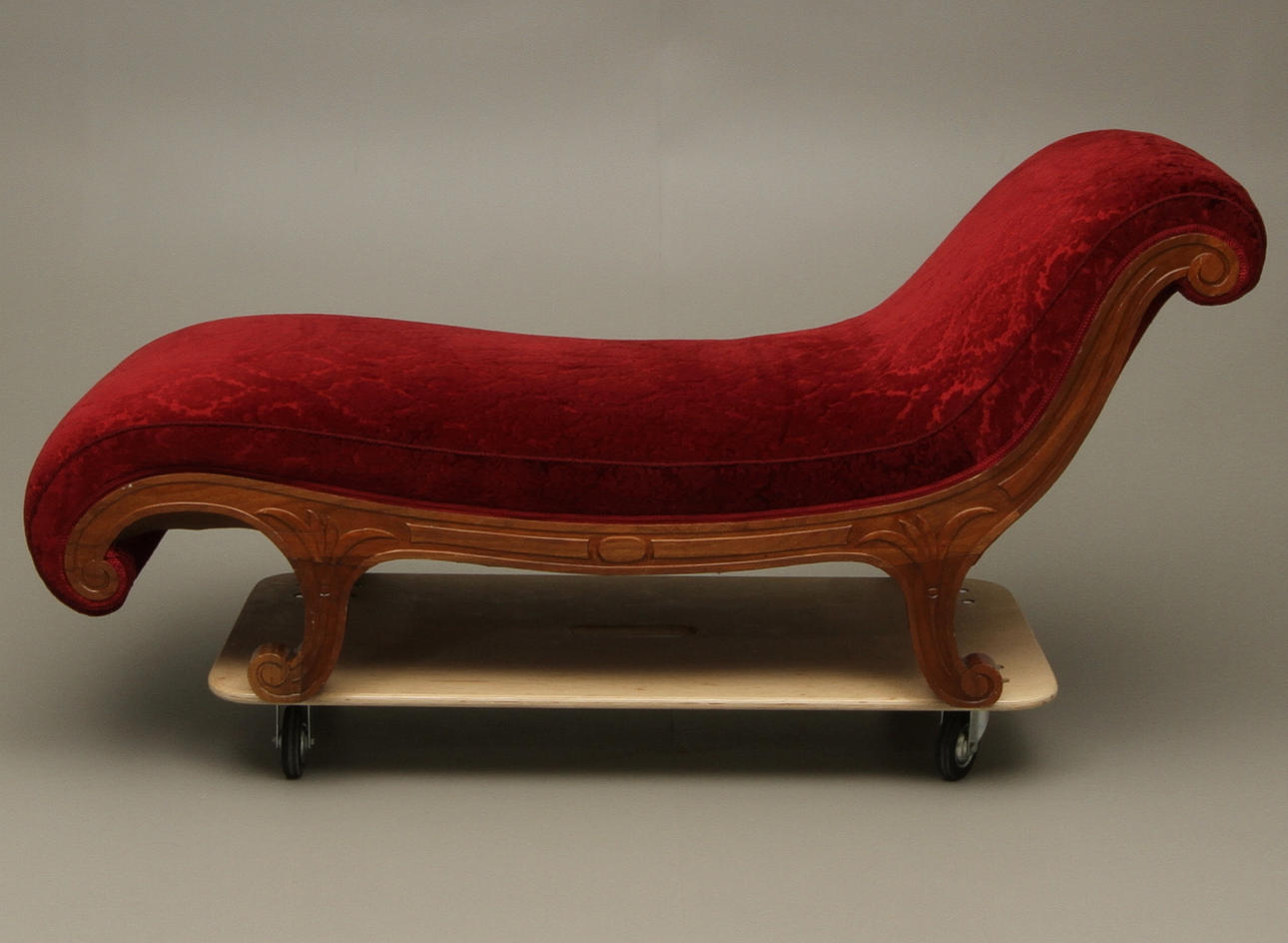 Röd klädsel, skuren dekor. Längd 170 cm.