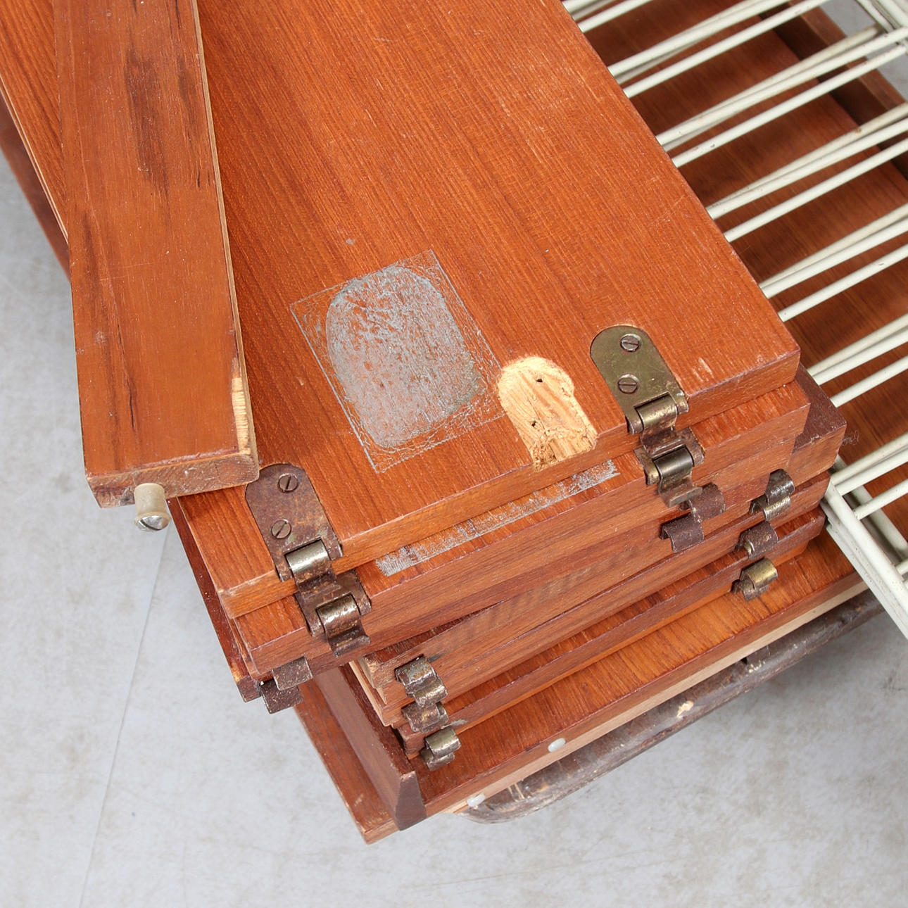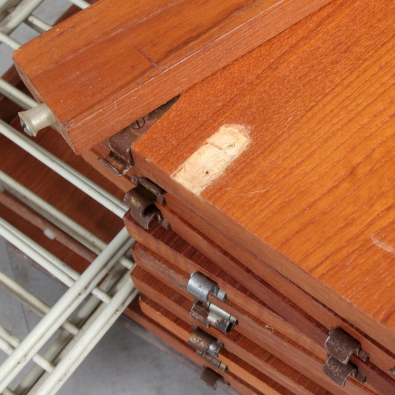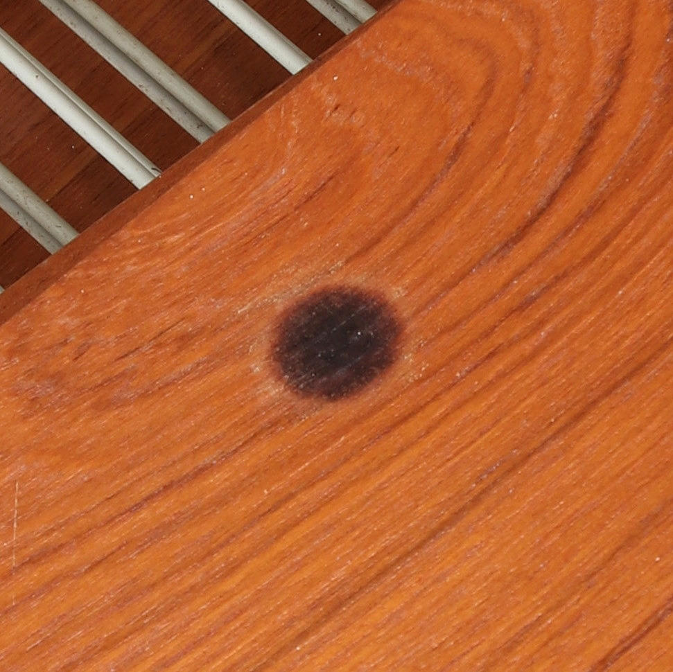 Slitage, repor, märken, rostiga beslag, Skador på ett hyllplans undersida samt bordsskiva. Fanerskador. Brännmärke på ett hyllplans undersida.