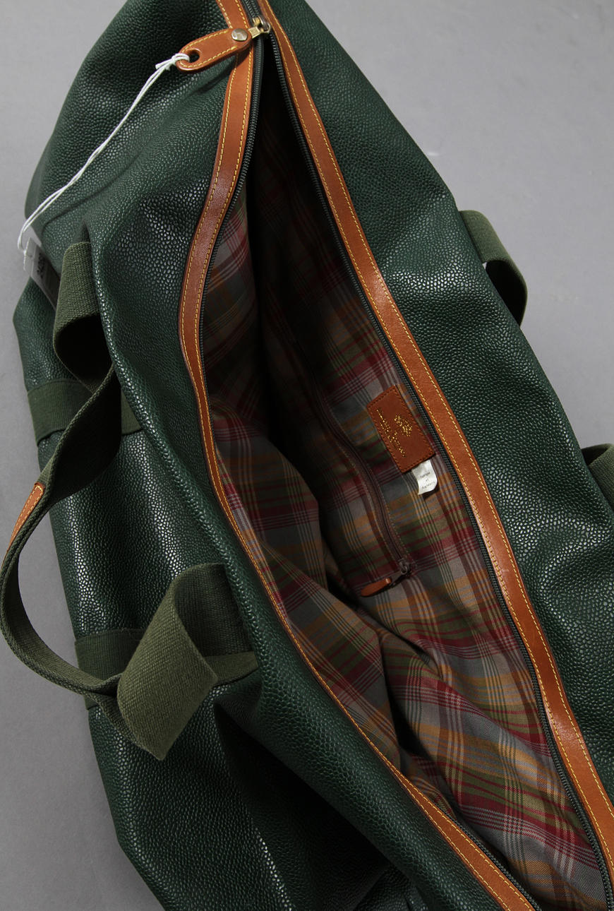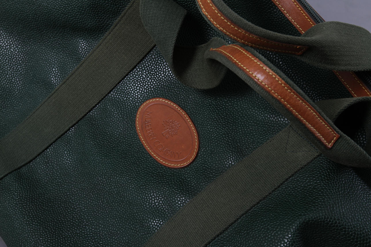 Grönt skinn, invändigt fodrad med rutigt bomullstyg. Märkt Mulberry Company, Made in England. Ca 40x60 cm.