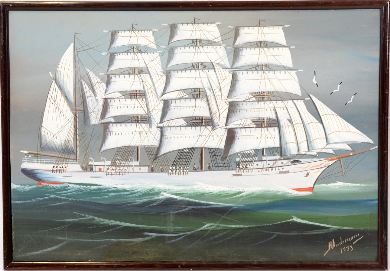 Fartygsporträtt. "Lawhill" sign och dat -33, 46x67 cm.