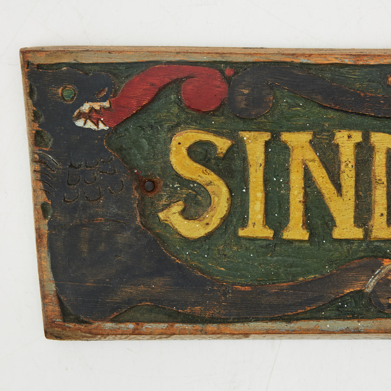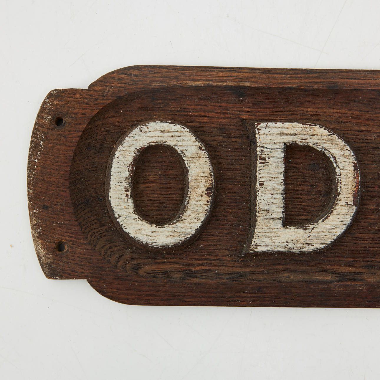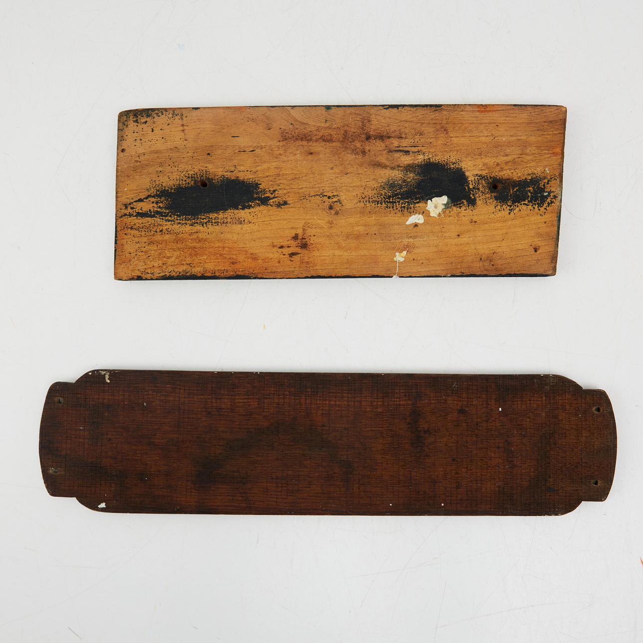 2430563. BÅTSKYLTAR, 2 st, "Sinbad" och "Odense", skuret trä.