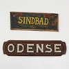 BÅTSKYLTAR, 2 st, "Sinbad" och "Odense", skuret trä.