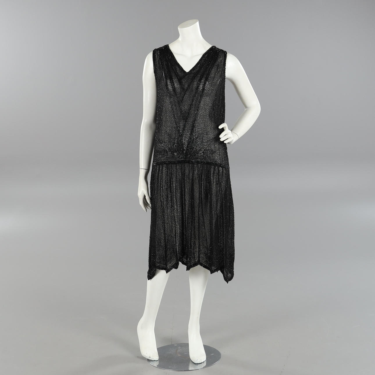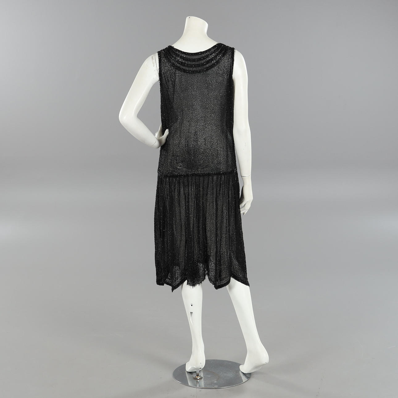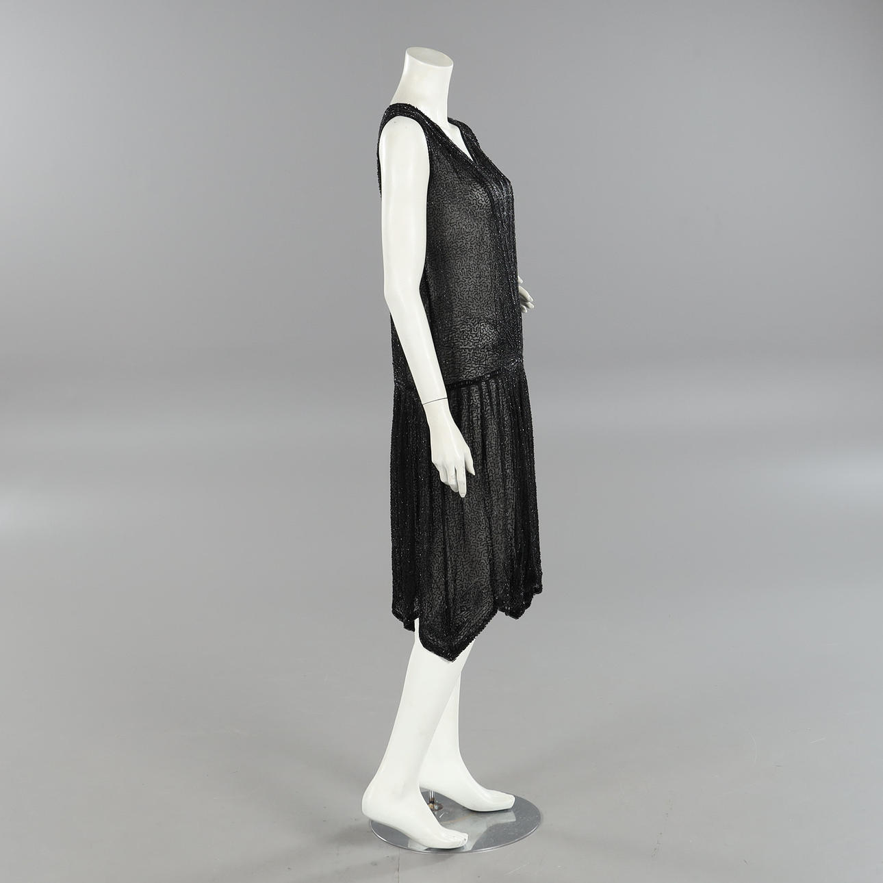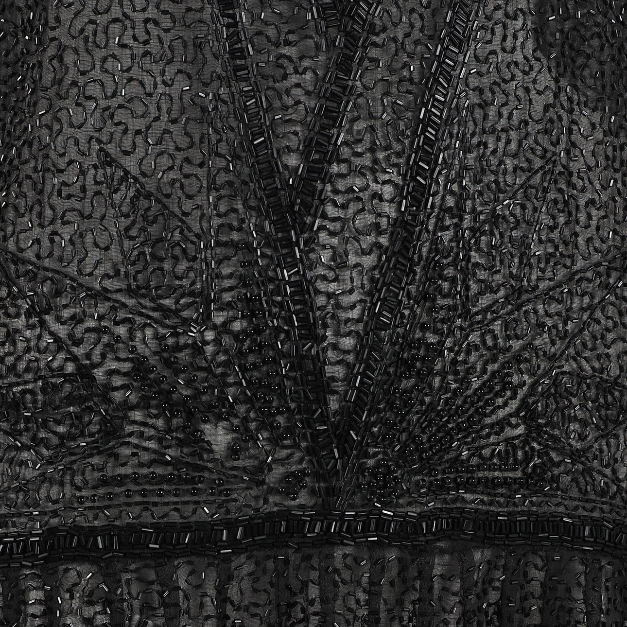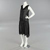 Klänning med glaspärlsbroderat mönster på svart tunn bomullvoile. Uppskattad storlek ca 38/40. Bystvidd ca 95 cm. Längd ca 110 cm.