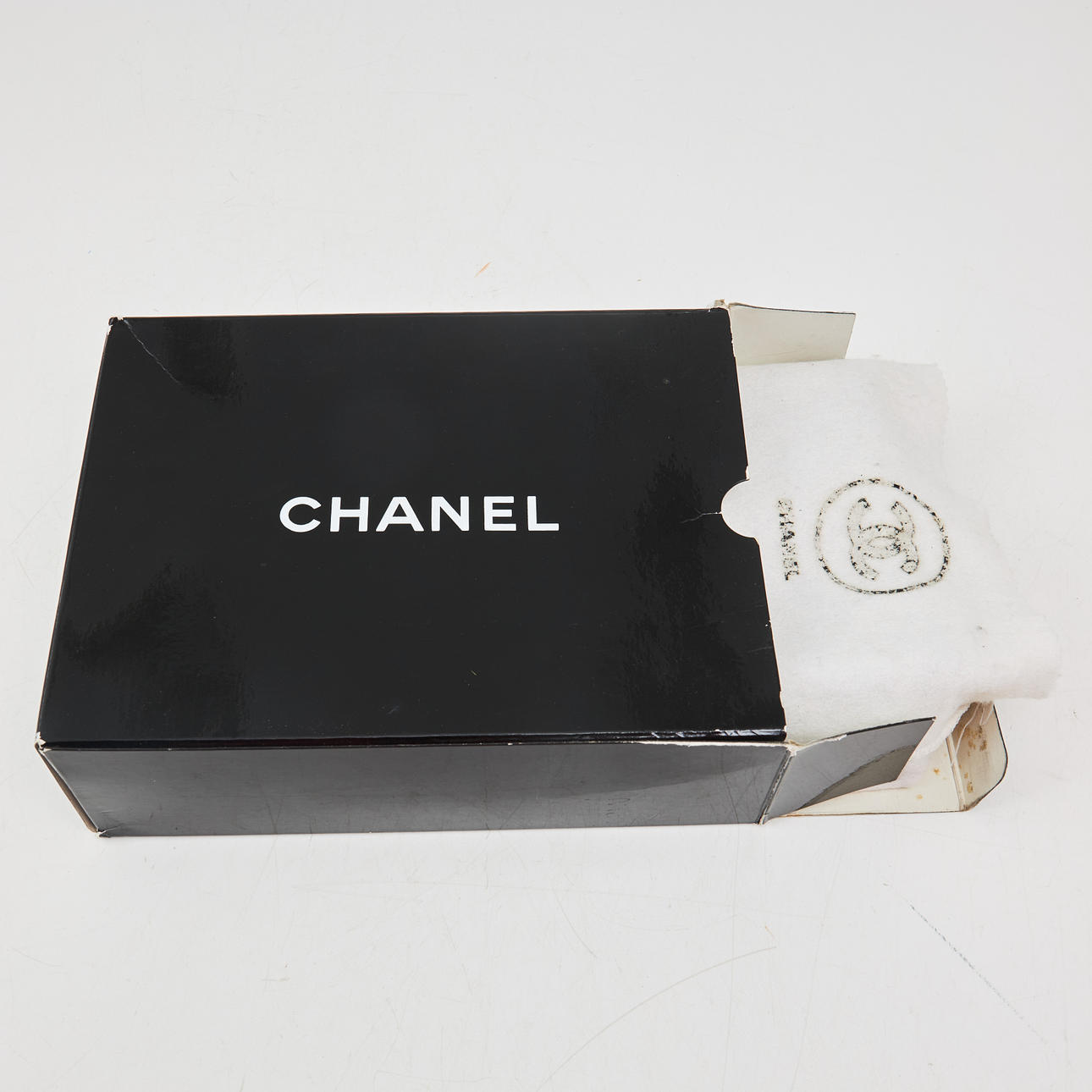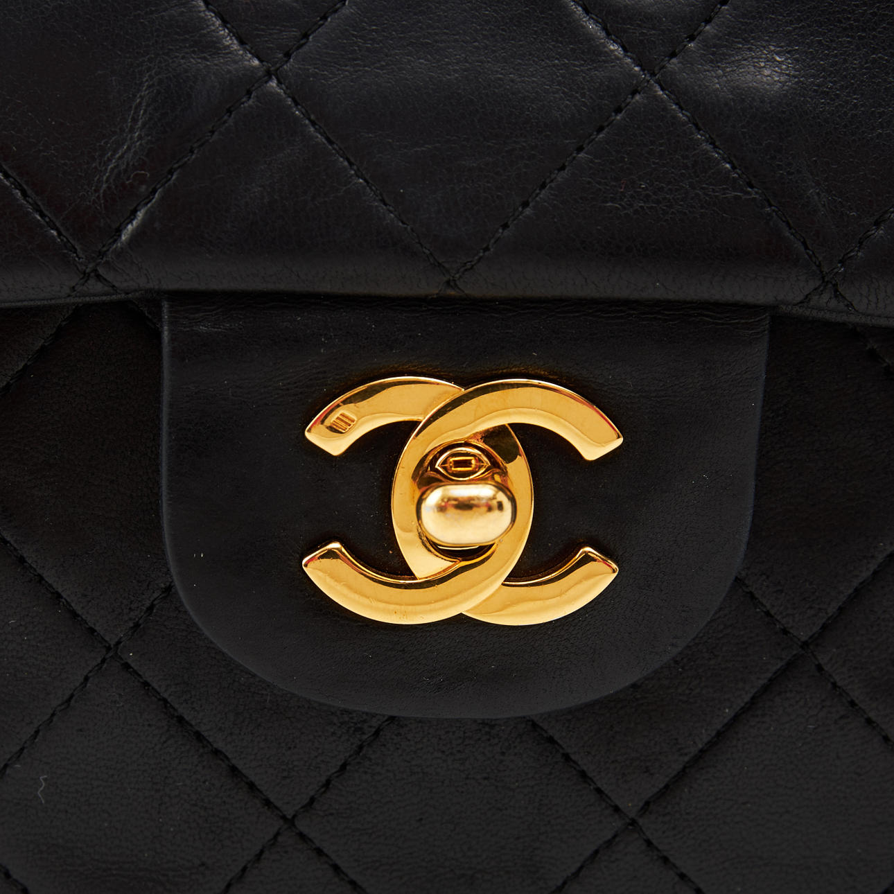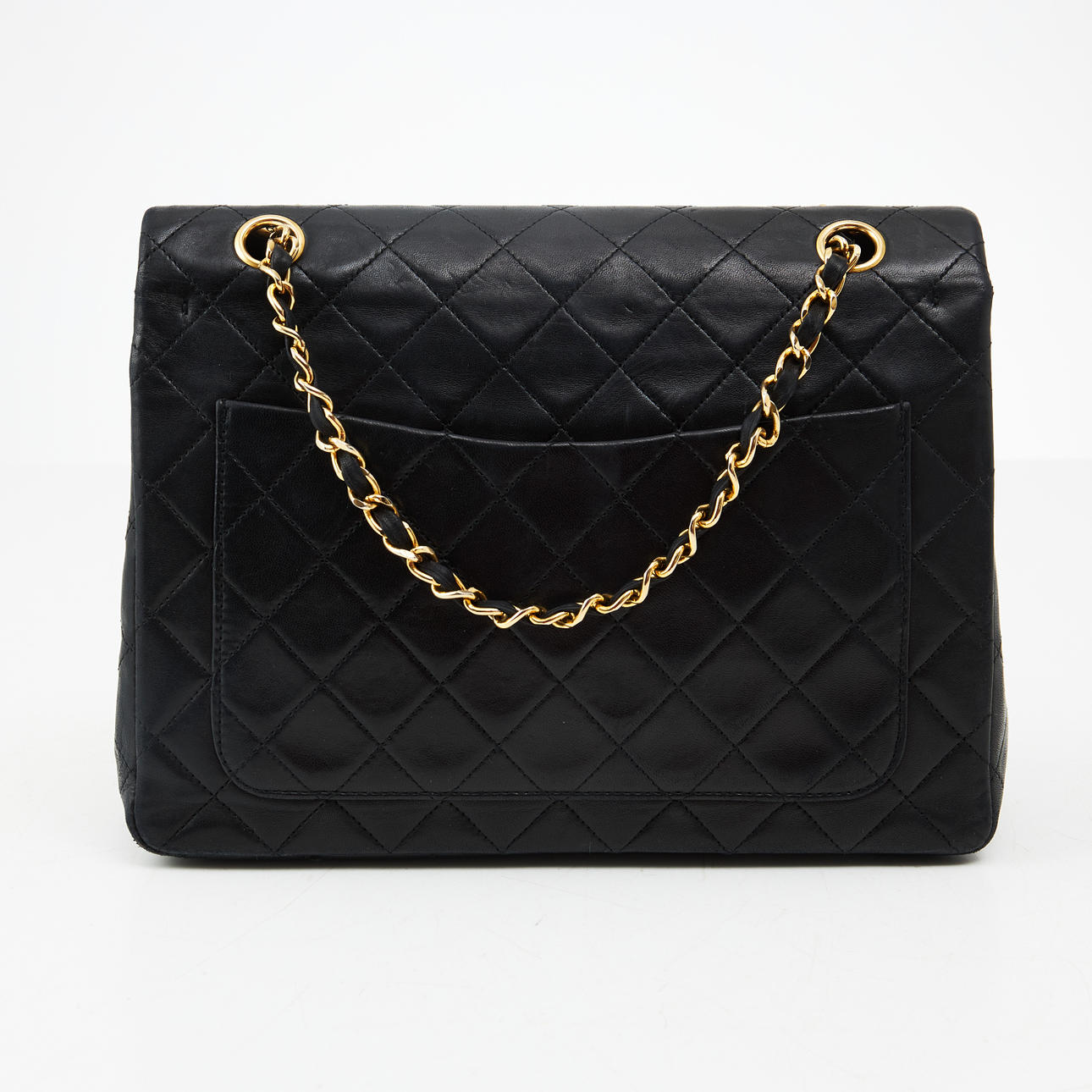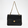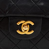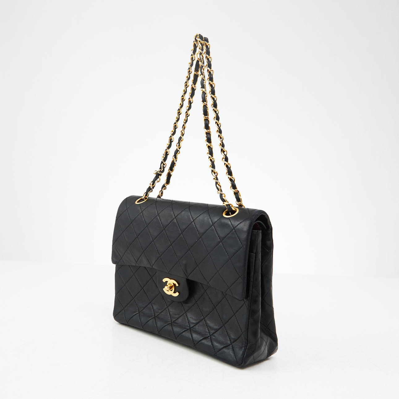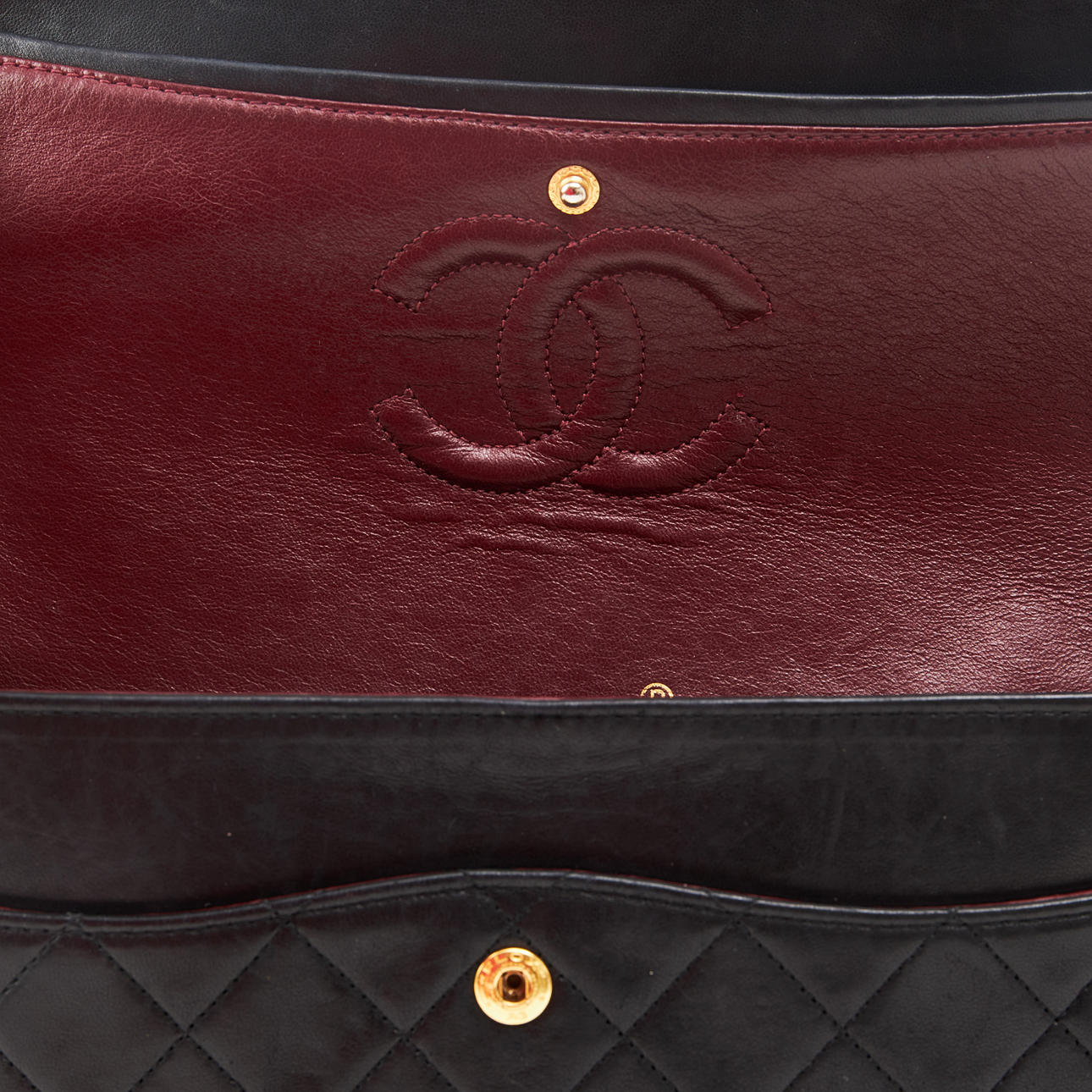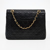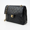 Svart quiltat lammskinn, monogramprytt CC-lås och länk i blank gulmetall med tvinnat skinnband, invändigt klädd med vinrött kalvskinn, inredd med totalt 6 fack varav ett med dragkedja samt ett fack för läppstift, etikettmärkt för år 1989-1991.