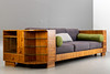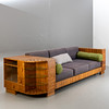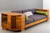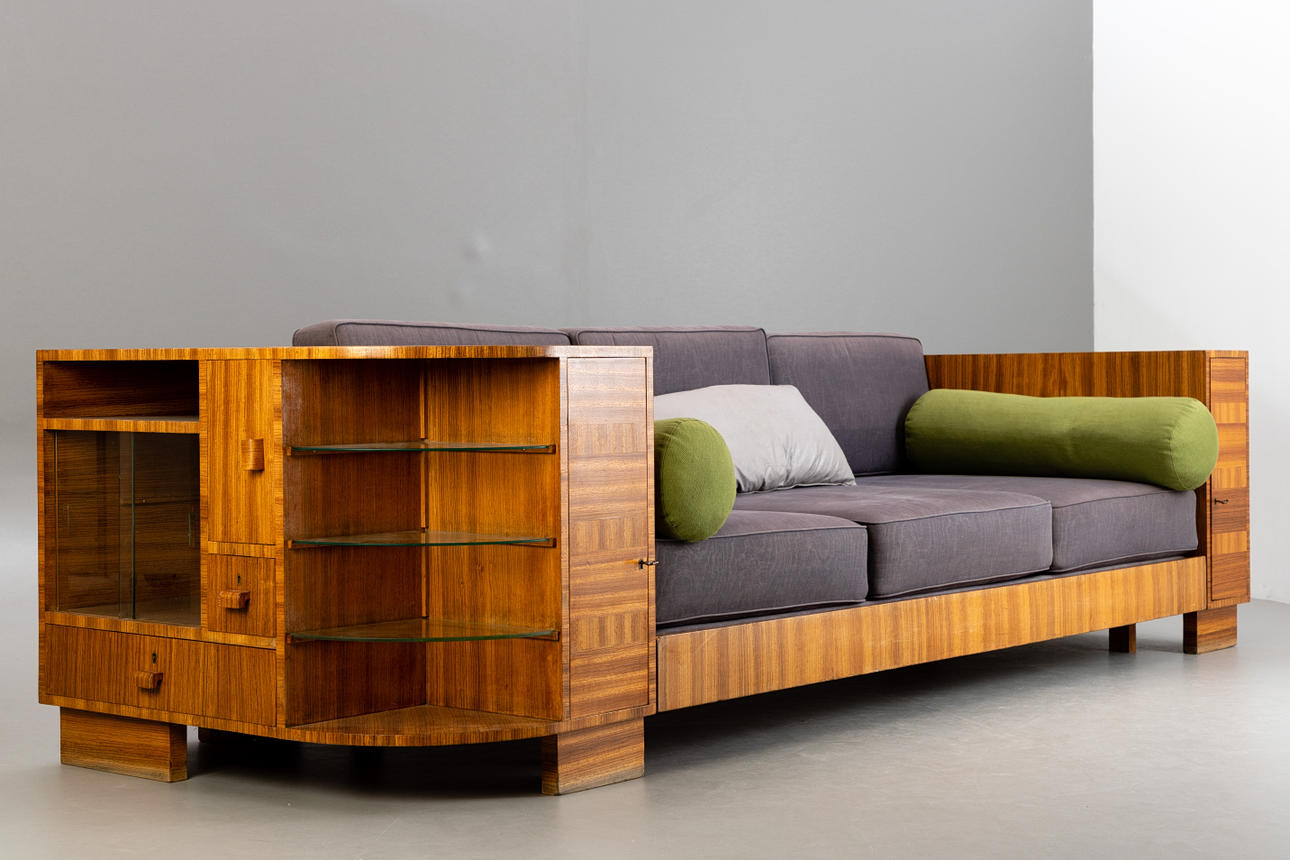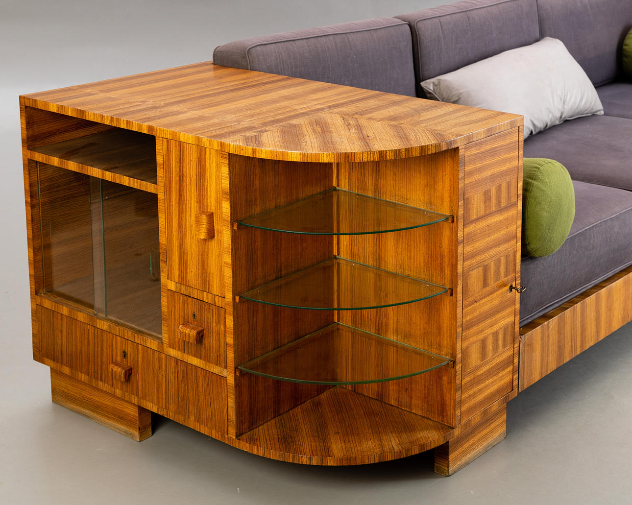 Stor Art Deco 3-sits soffa från 1: a 1900-talets hälft. Trä- och glaskonstruktion Troligen bambufaner. Sidopaneler med integrerat barskåp och förvaringsutrymme. Lösa stoppade kuddar täckta med grått och grönt linnetyg. Soffa kan demonteras i enskilda delar.