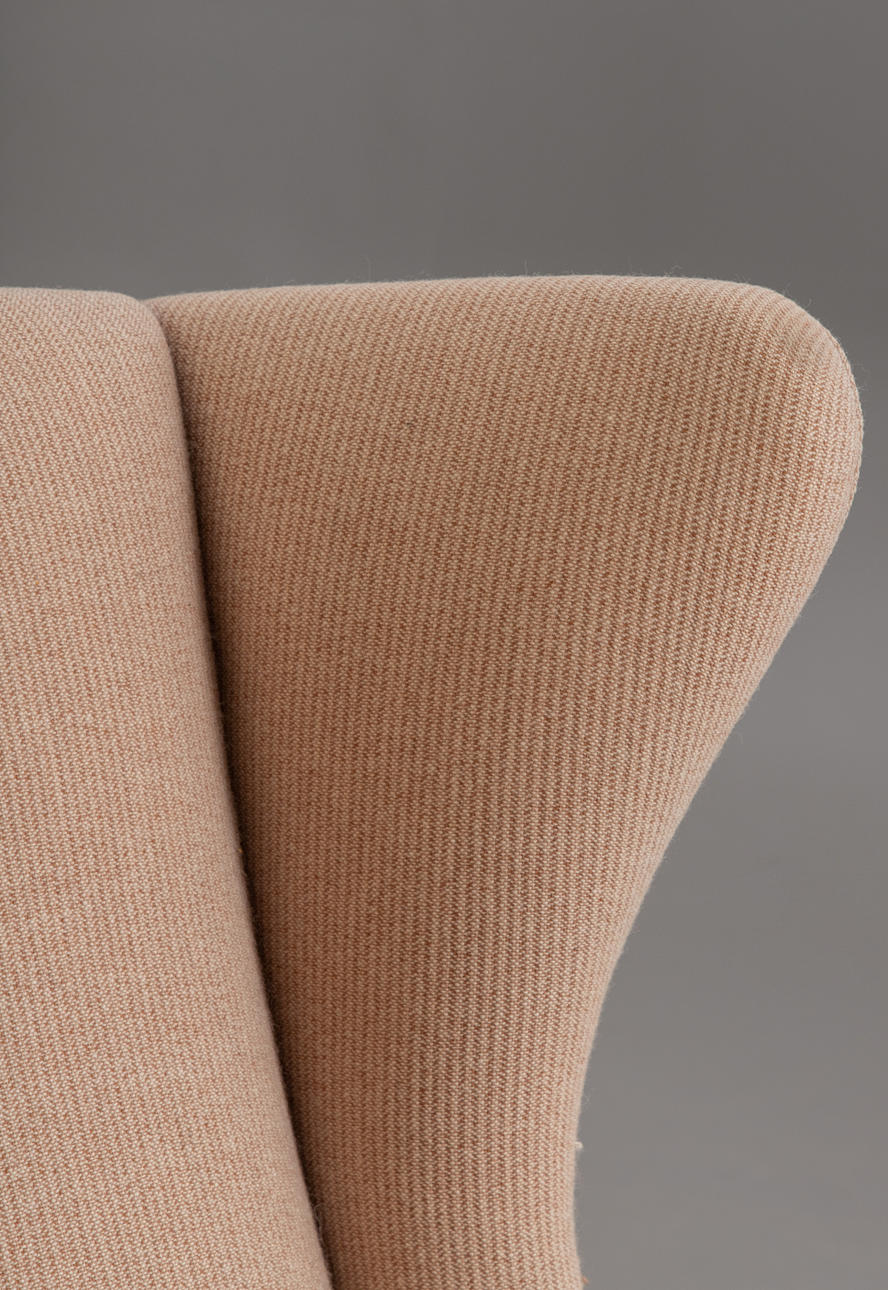 Dansk design Stoppad vingstol täckt med ljust tyg.