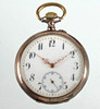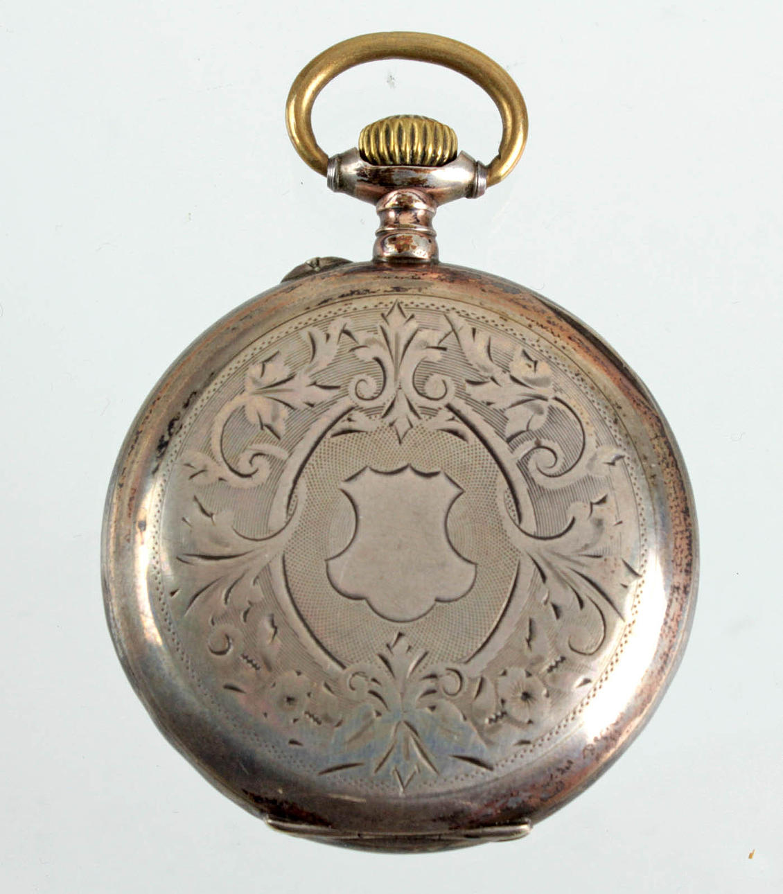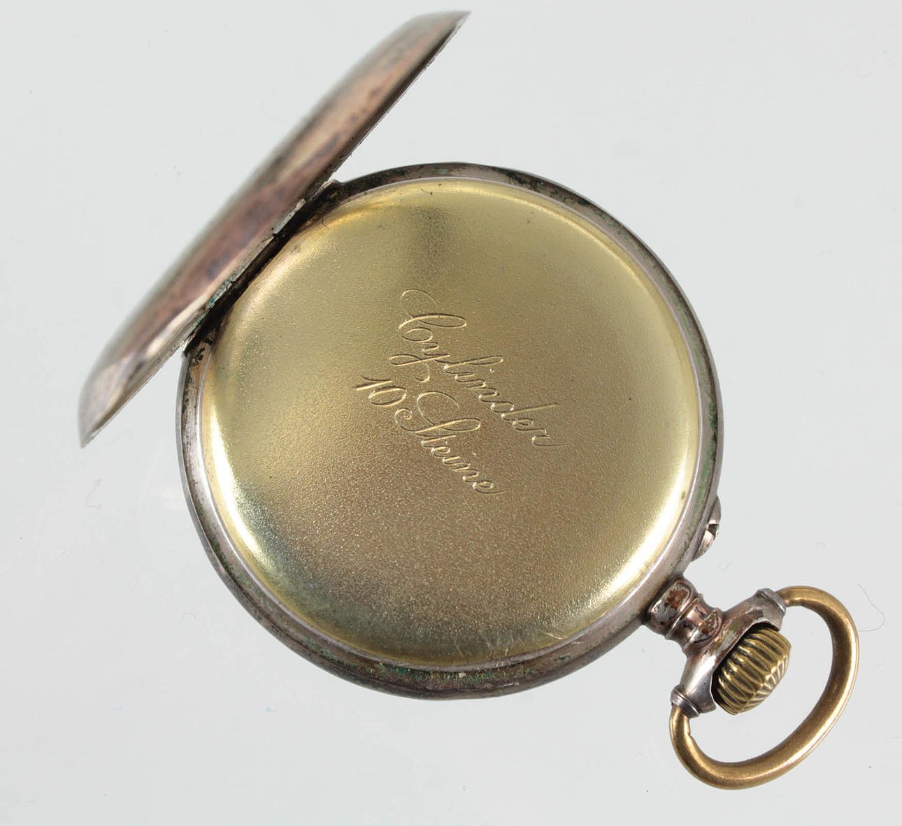 Klockboett i silver 800, stämplad tyska, ca. 71,6 gram, delvis förgyllda, gratis blommigt kantad vapensköld cartouche på en fin guilloché bakgrund, vit emalj urtavla med svarta arabiska siffror, guldfärgade minutpunkter och dekorativa händer, små sekunder klockan 6, handlindad mekanism startar, metall dammskydd märkt * Cylinder 10 stenar*, diameter ca. 47mm, bära.