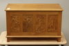 Ek. Skuren dekor i form av de fyra årstiderna. Inrede med skjutbrt fack. Längd 96, bredd 50, höjd 58 cm.