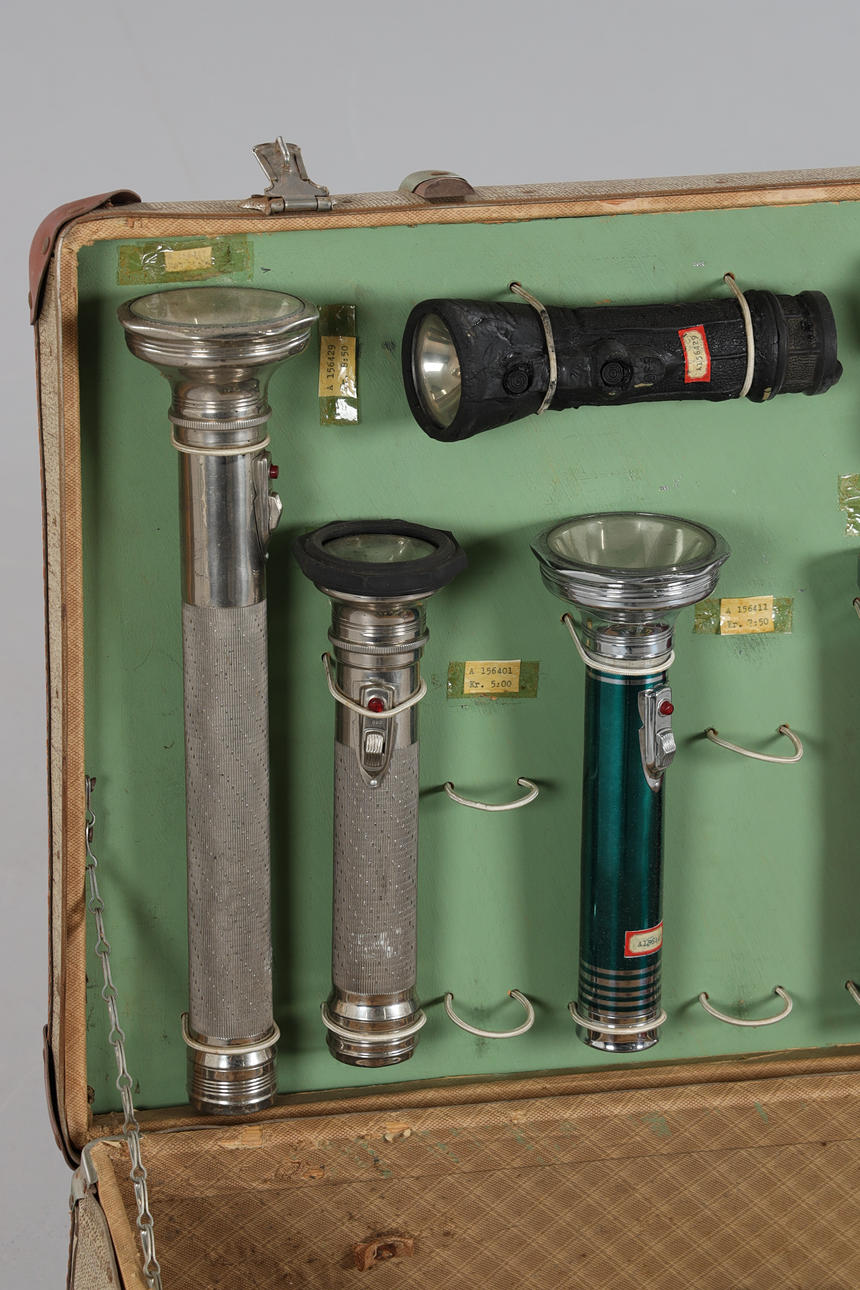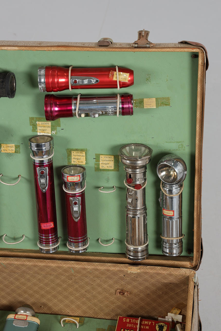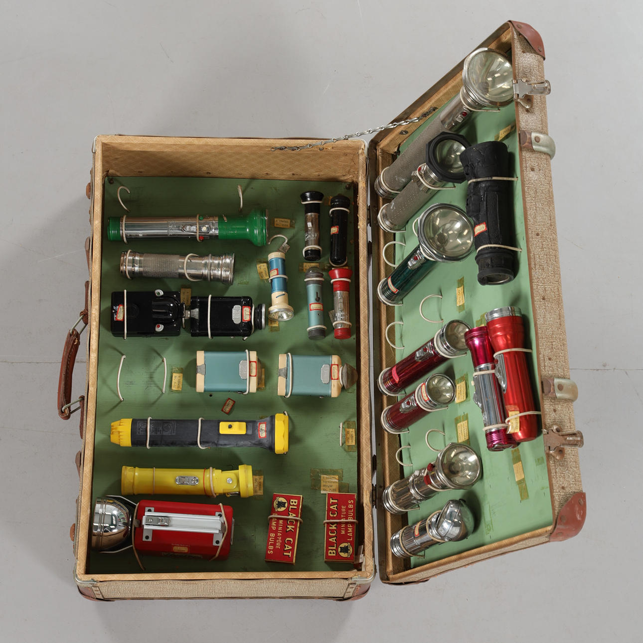 Diverse ficklampor i metall och plast, bla märkta JERB Sweden. I Koffert med måtten ca 22x42x70 cm.