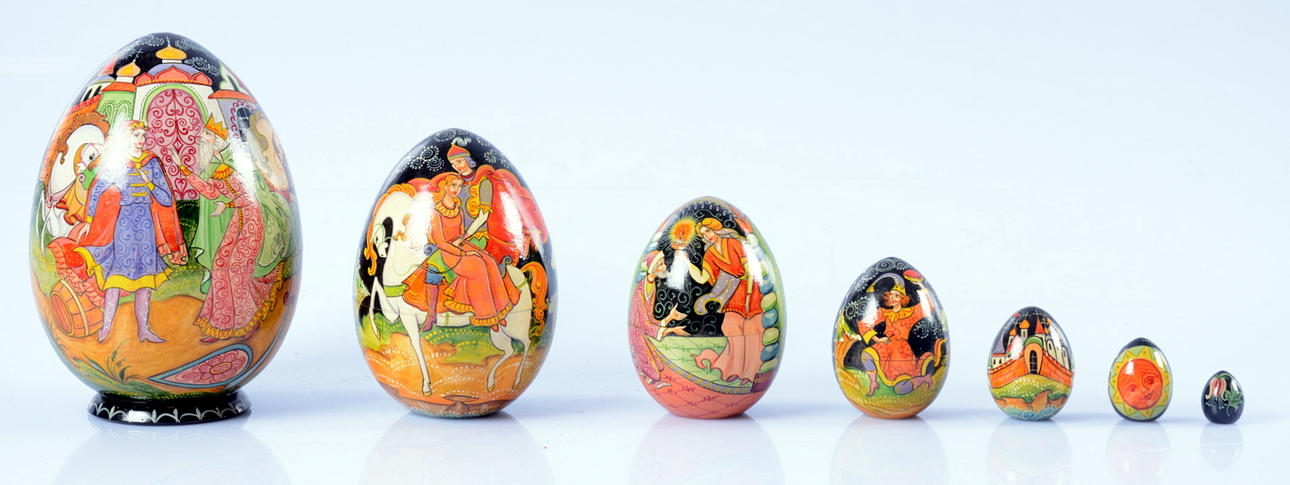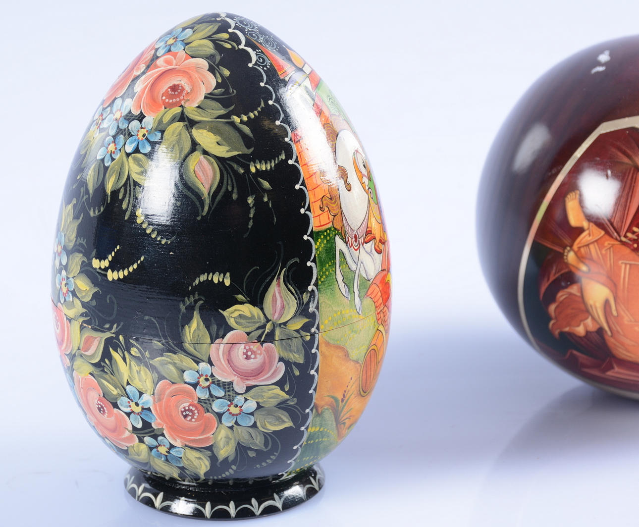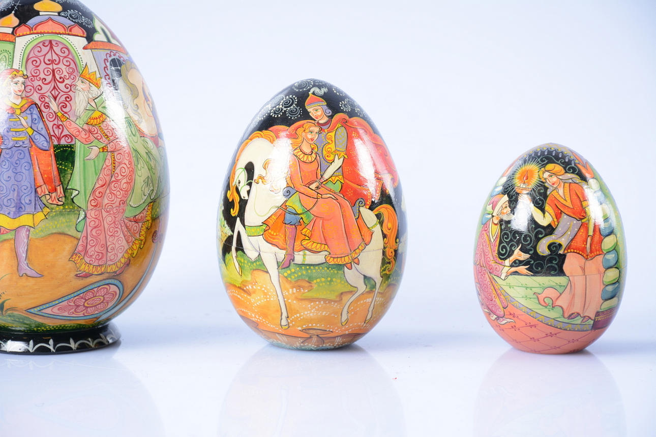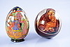 Höjd 12 cm samt 15 cm. Det större ägget delbart med småägg inuti.