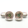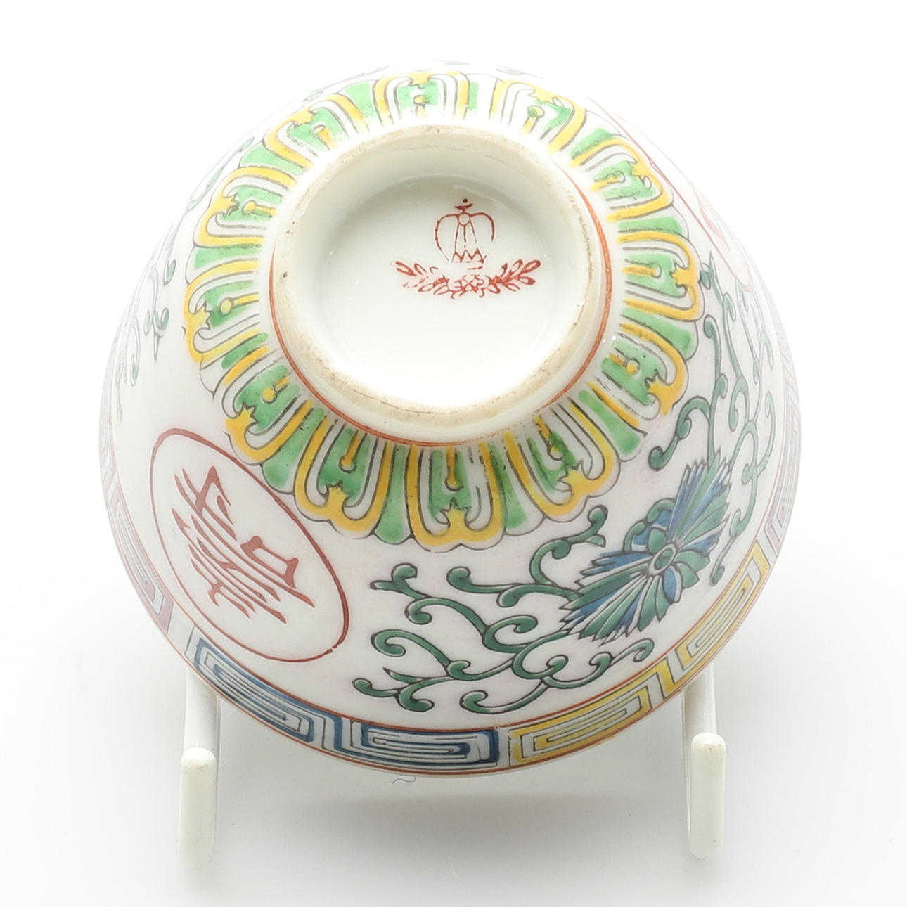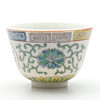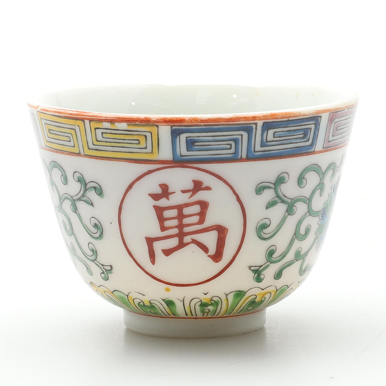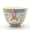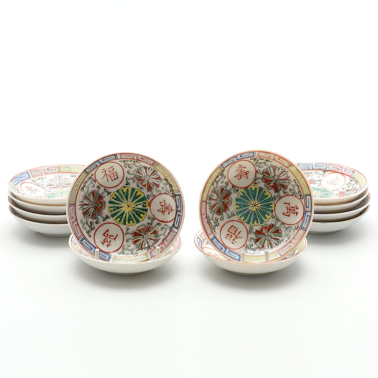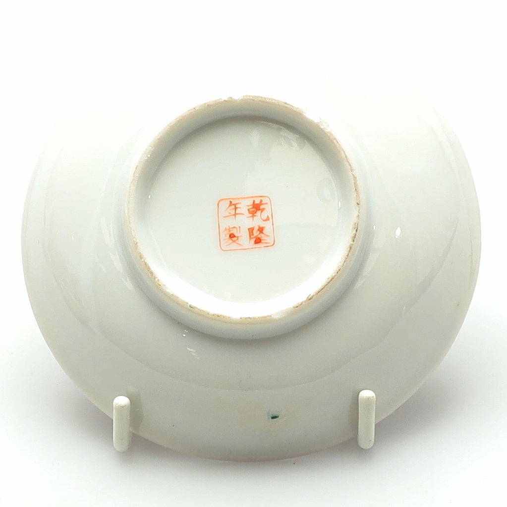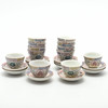 av den senaste tillverkningen, dekorerad med blommor och paneler med kinesiska tecken, suacers med röda fyra tecken märke inom en fyrkantig ram, koppar diameter 7,5 cm, fat 10cm diameter (24).