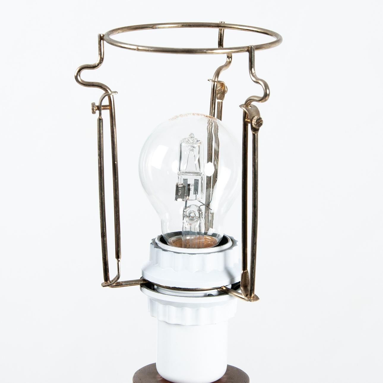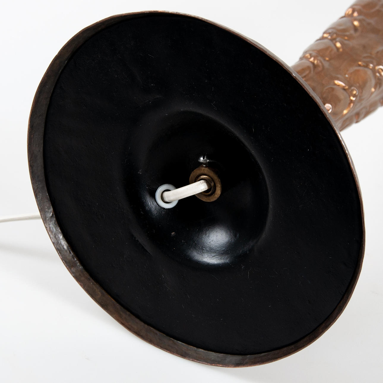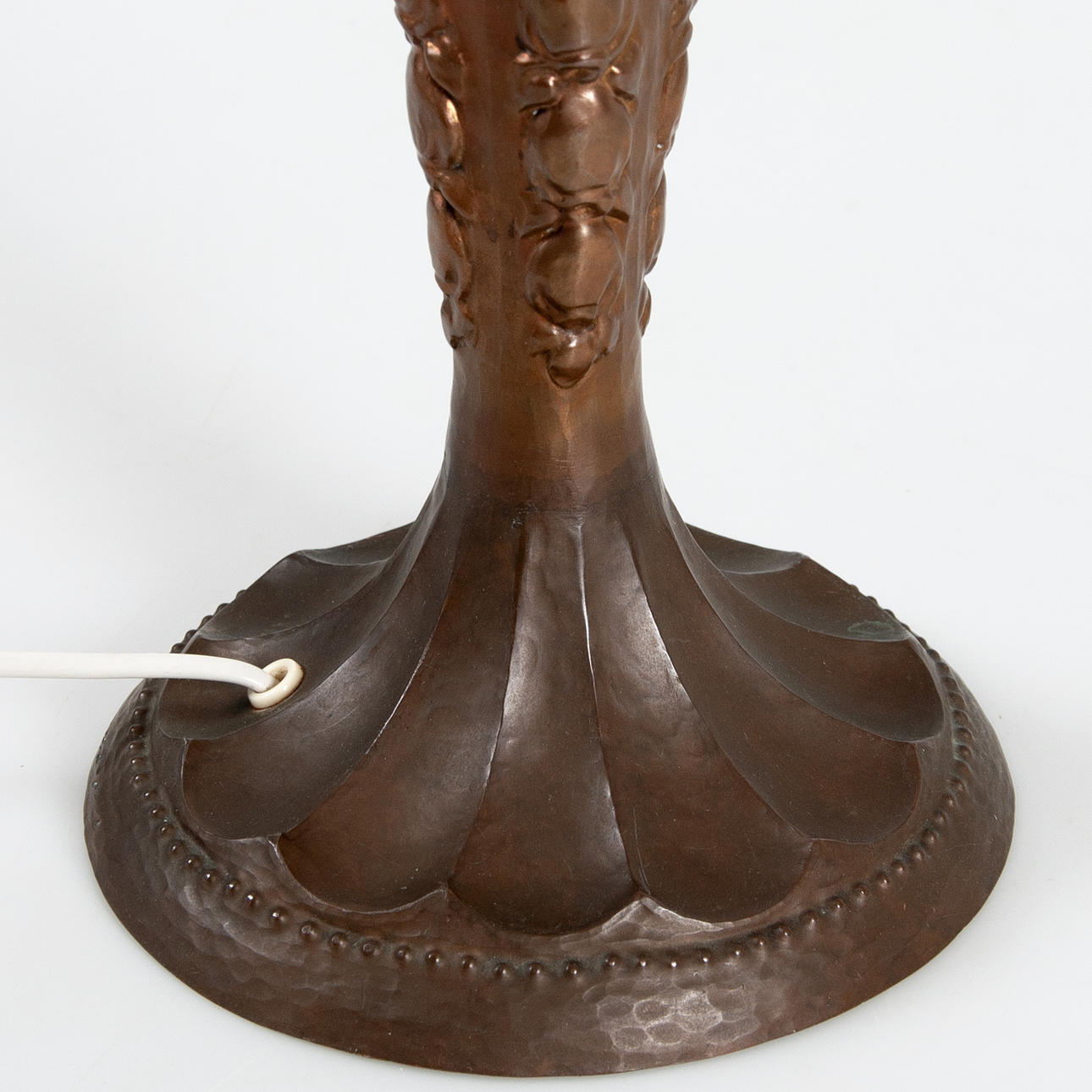 Bordslampa, koppar, kring sekelskiftet 1900, senjugend, höjd inkl. lamp/skärmhållare 50 cm (utbytt lamphållare, ojordad kontakt), fotring diameter Ø18 cm.