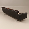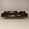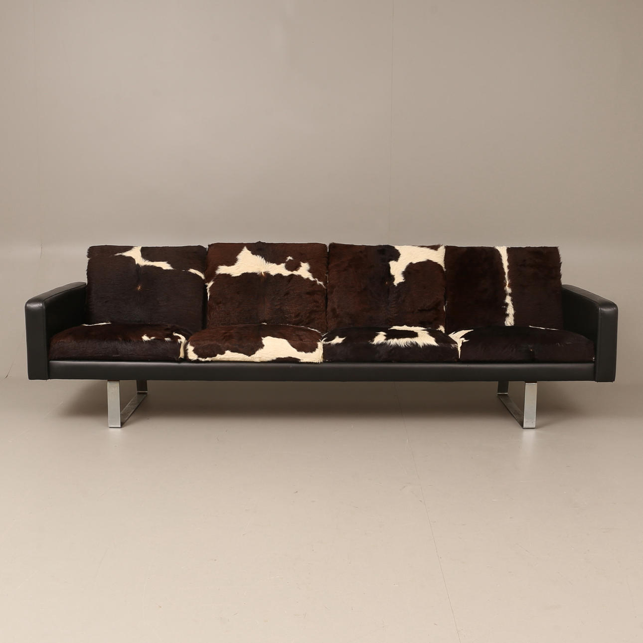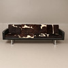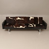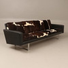 Höjd cirka 66 cm, sitthöjd cirka 40 cm, längd cirka 240 cm. 4-sits, skinn samt benstativ i kromad metall, plymåer klädda i kohud.