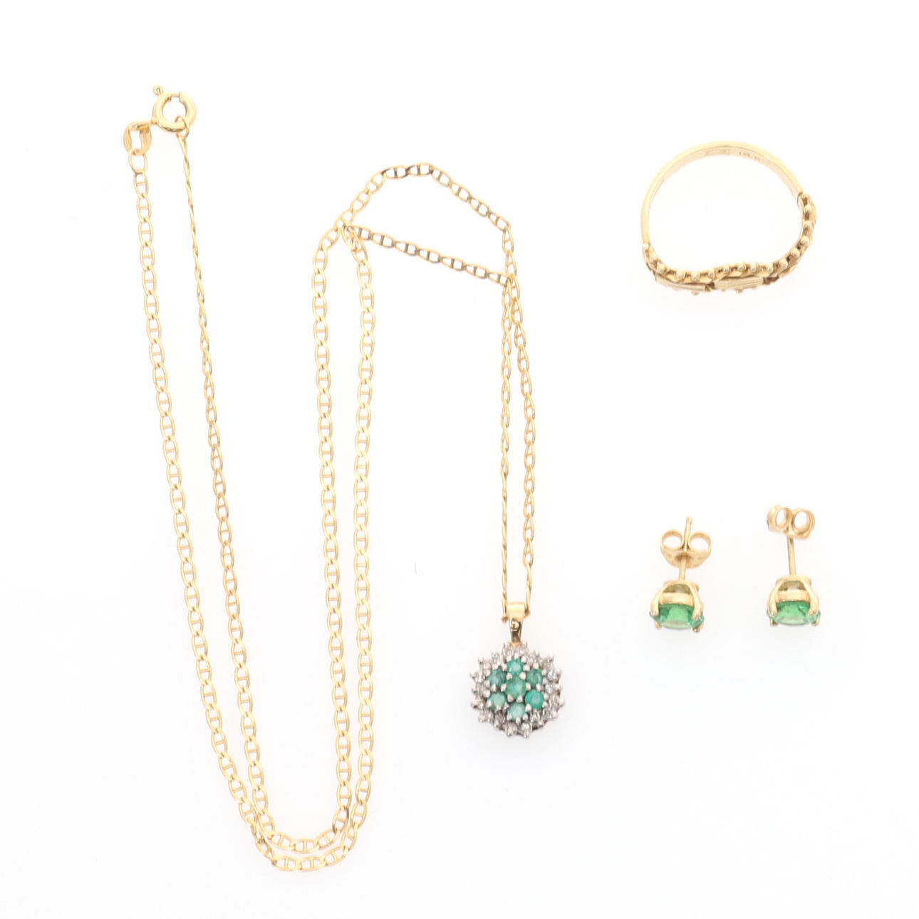 Med ledad topp skaft, en 375 mark ankare länk hals-kedja med ett kluster hänge och ett par 585 mark dubbade örhängen set med en grön färgad sten, 7g brutto.
