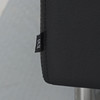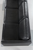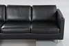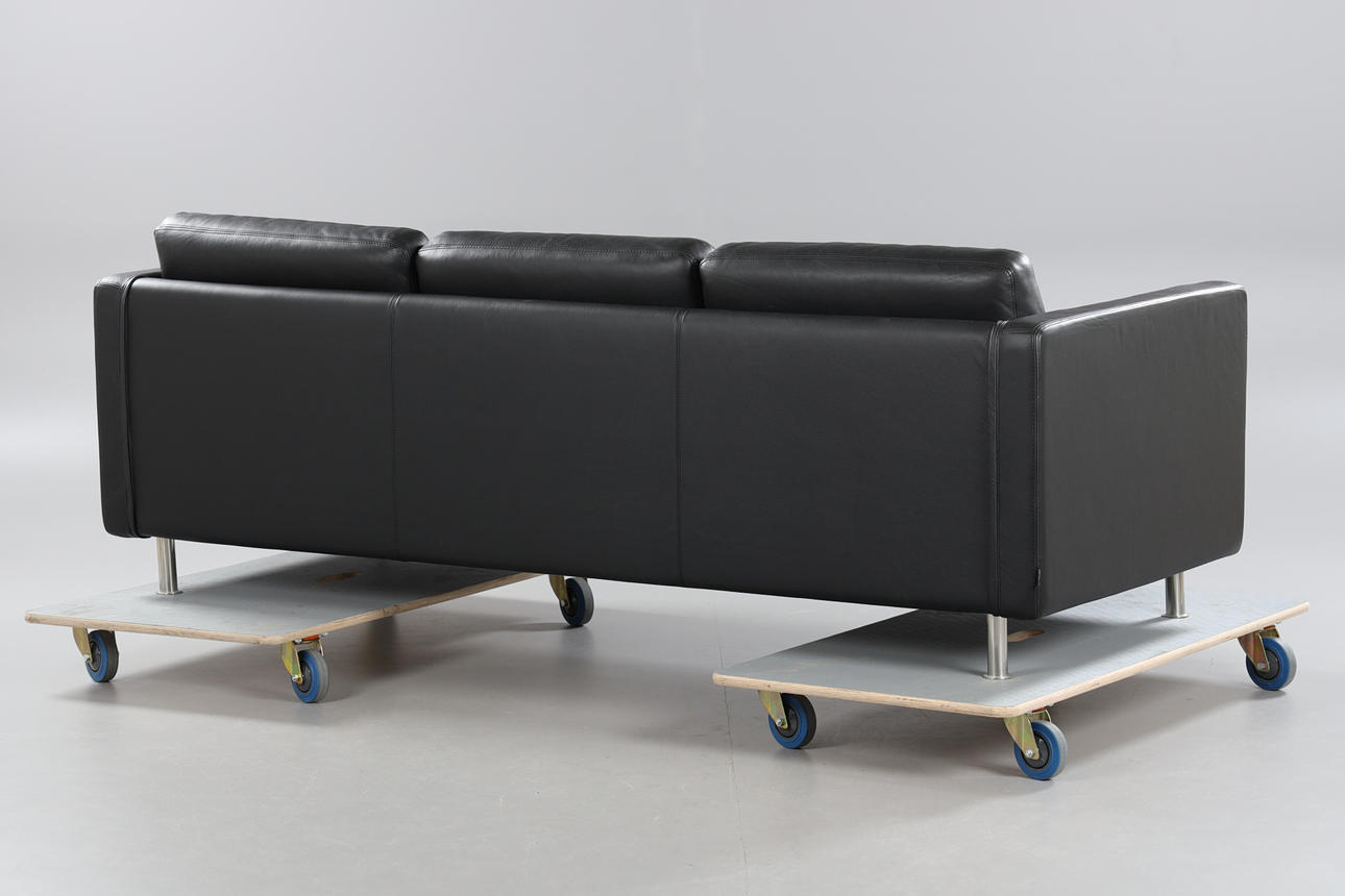 Svart skinnklädsel med lösa plymåer, kromade ben, märkt med etikett, längd ca 207 cm, sitthöjd ca 40 cm.