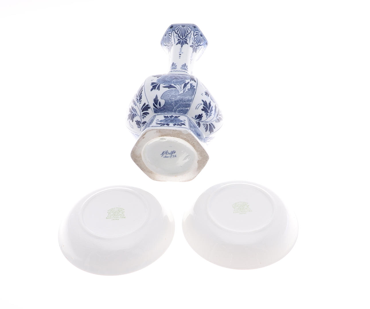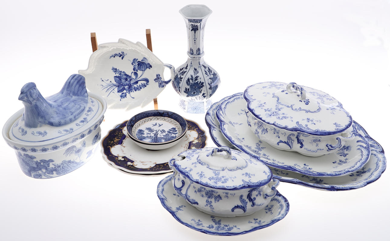 inklusive en Royal Copenhagen bladrätt, 23cm diameter, Ridgeways"Chiswick” middagsvaror, en Delft keramikvas, 26cm hög, par Chamberlains Worcester-tallrikar.