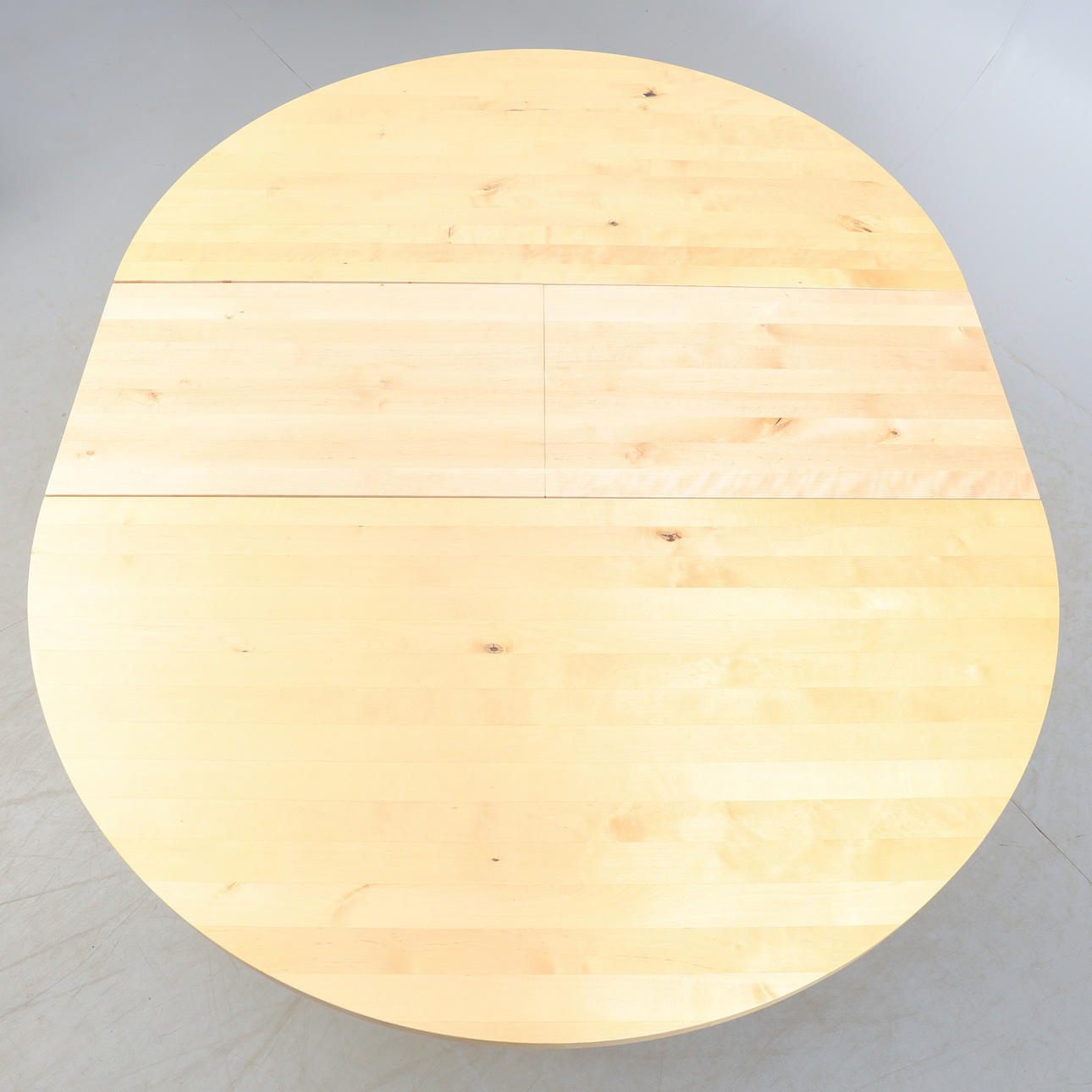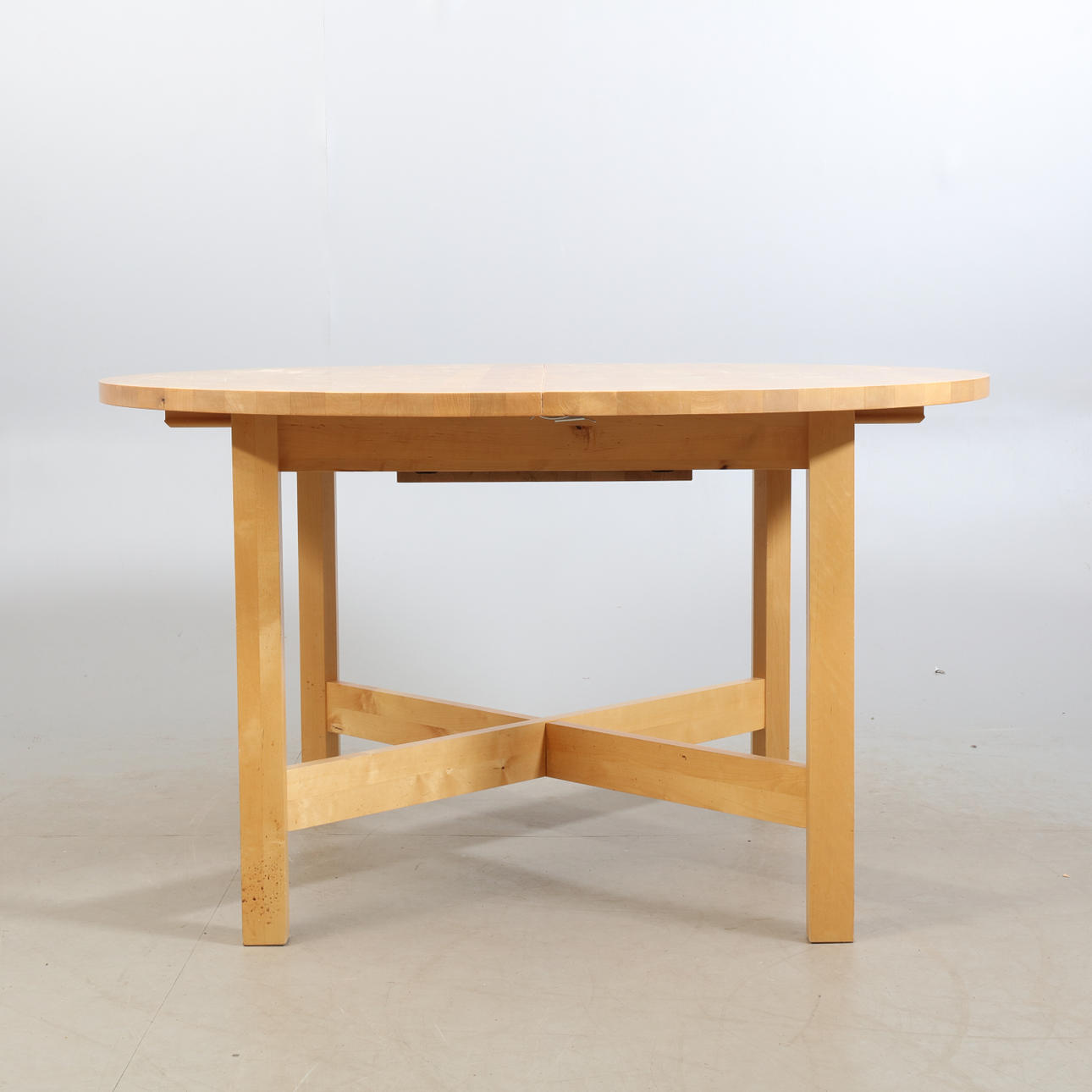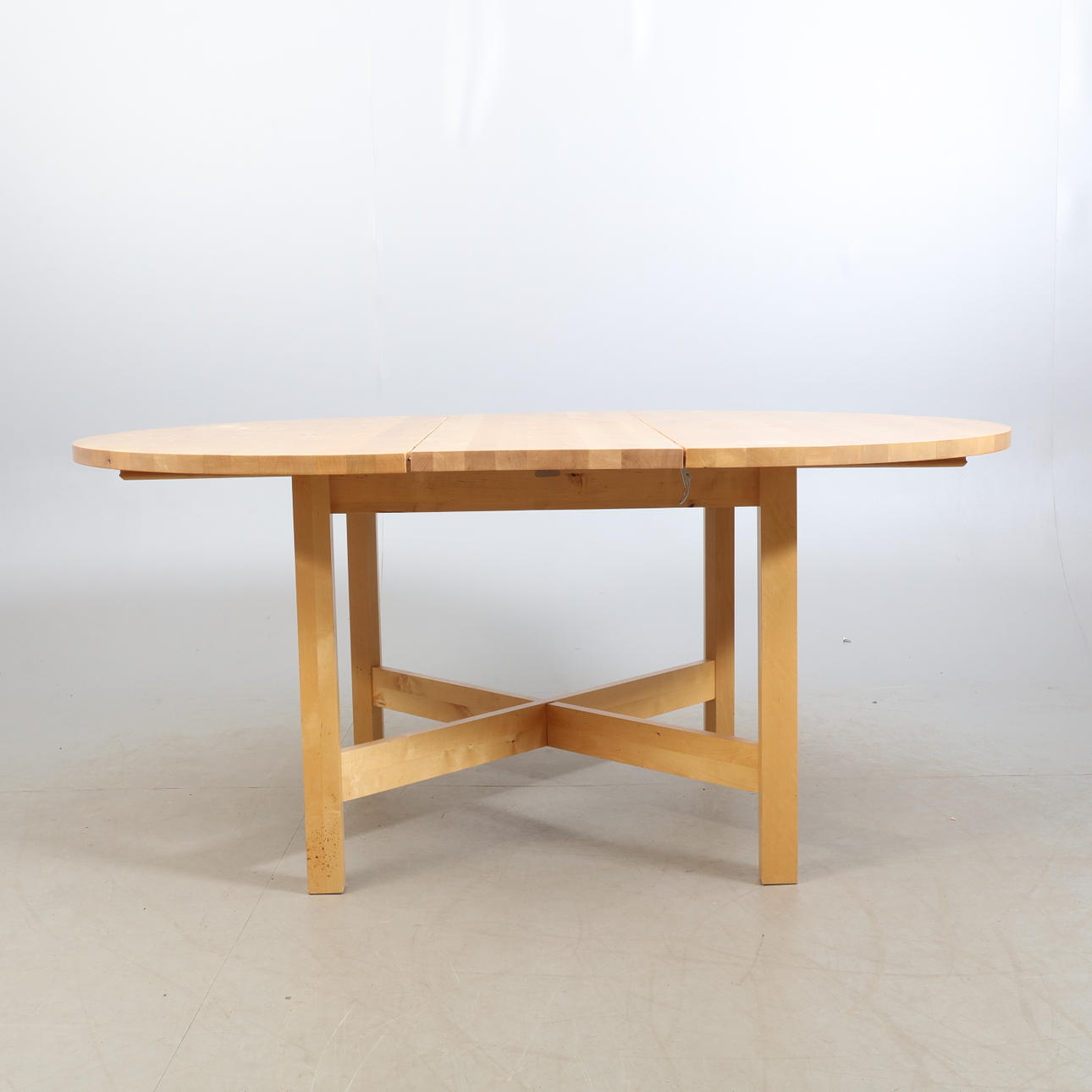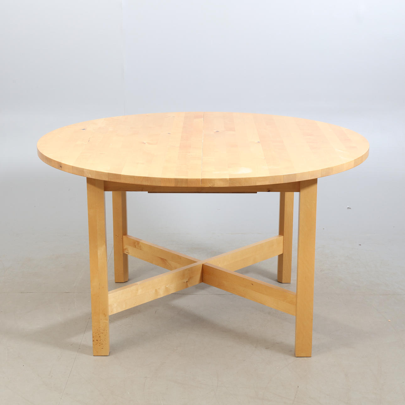 Diameter ca 130 cm, Höjd ca 76 cm, infälld iläggsskiva ca 40 cm