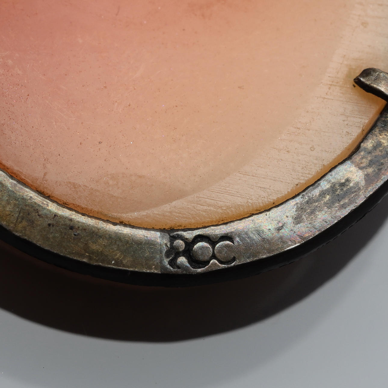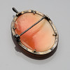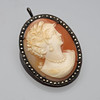 Brosch med snäckkamé i silverram med markasiter. Mått: 3,9cmx27cm. Tillverkad av Mikael Gustafson. Broschen går även att använda som hängsmycke.