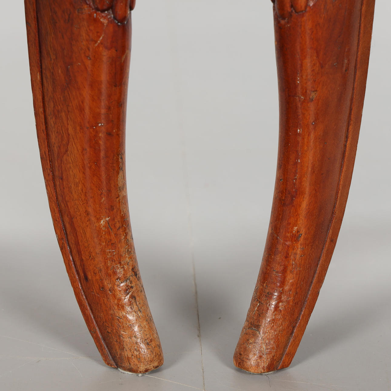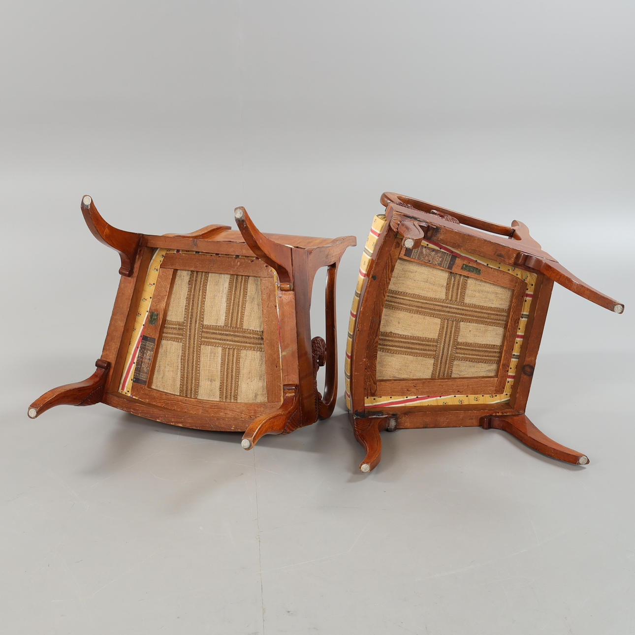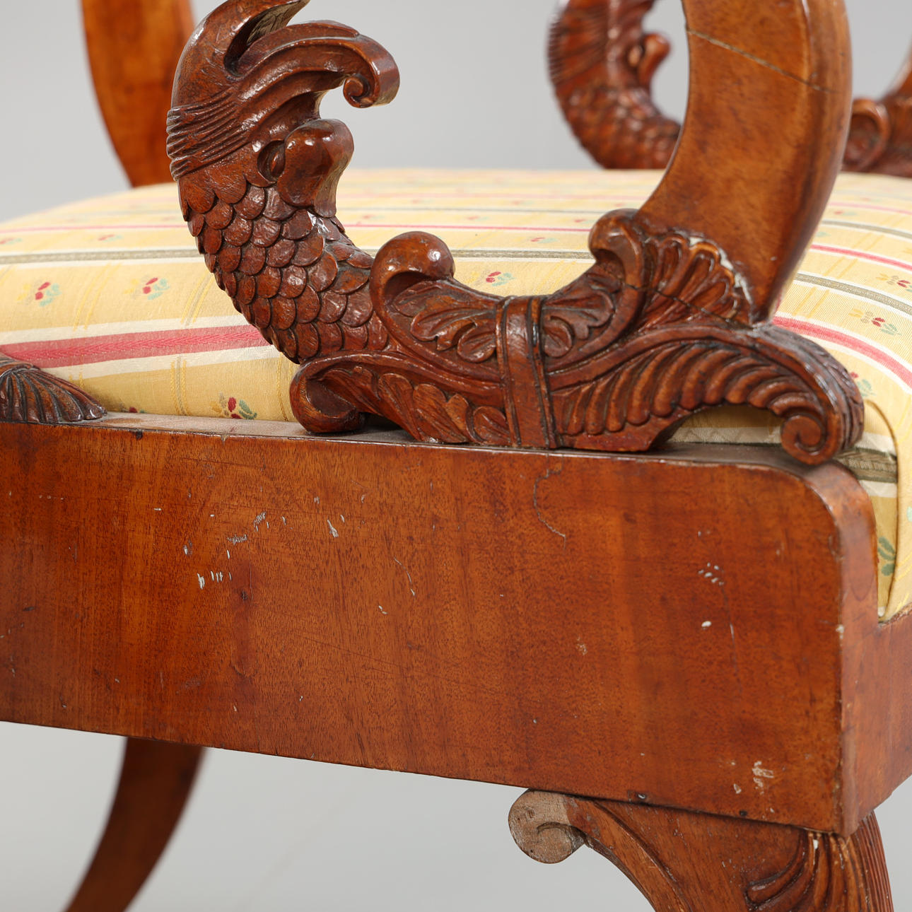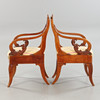 fanerade i mahogny, armlän med dekor med fiskar, skuren dekor, sitthöjd ca 45 cm.