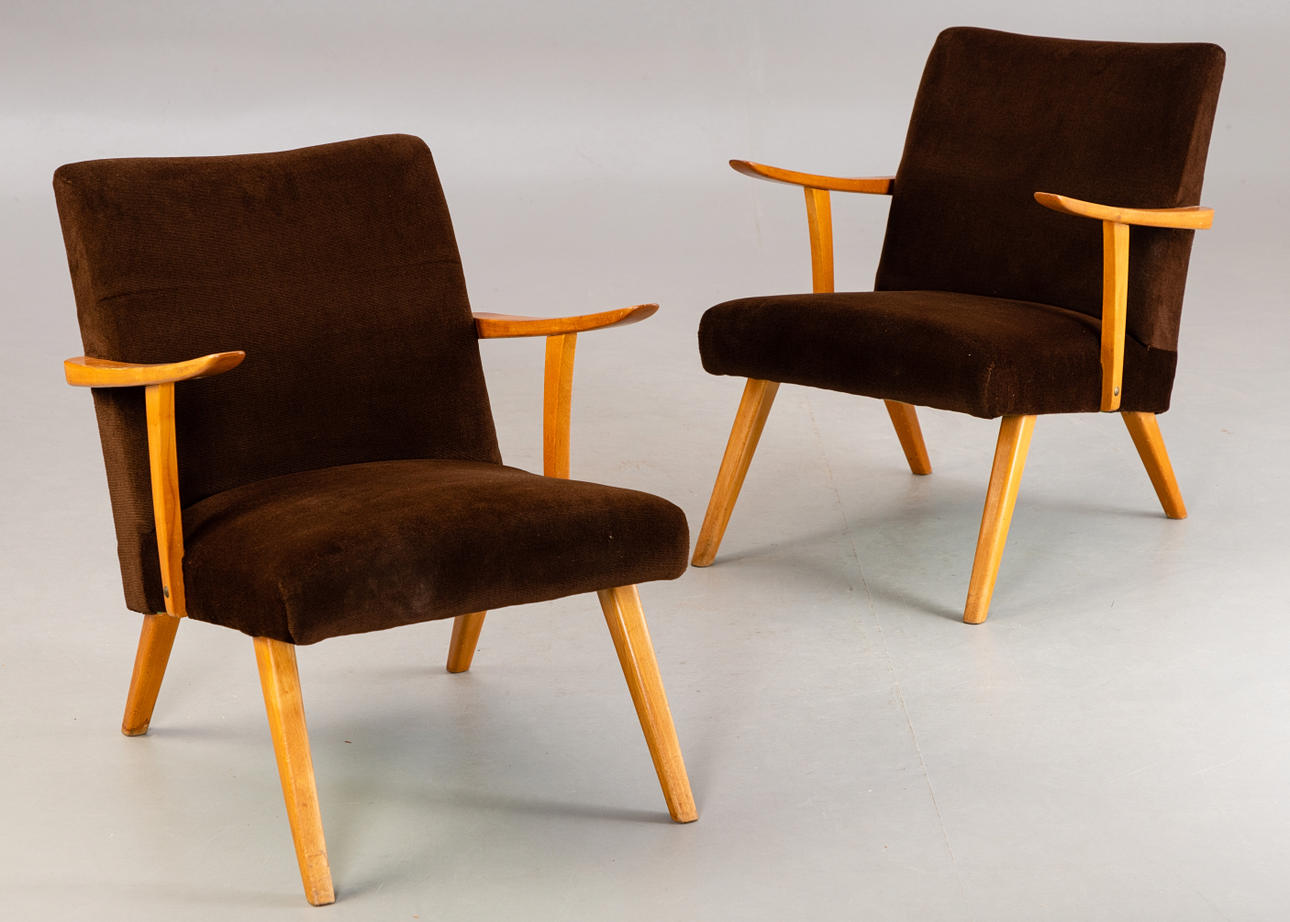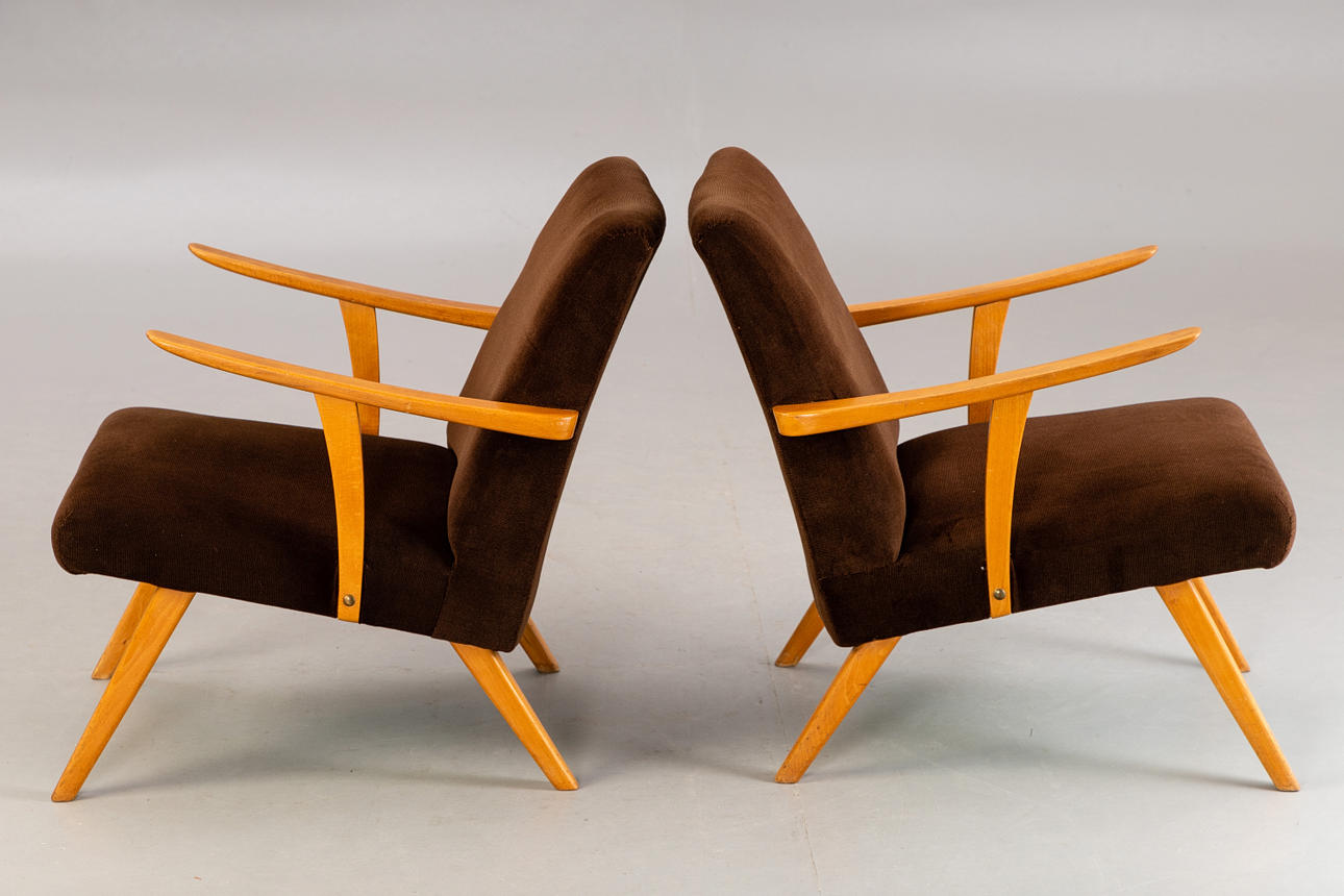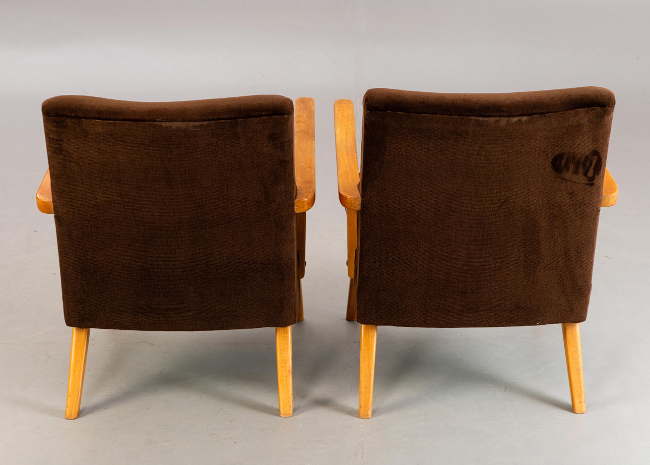 KNOLL ANTIMOTT, fåtöljer, ett par. Tyska mitten av århundradet design träram Klädd och täckt i brunt tyg