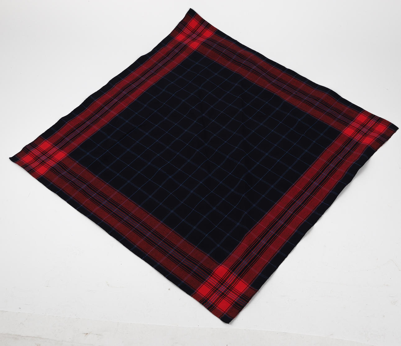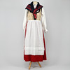 Blus i linne med broderier, livkjol i ylle, sammet bl a, längd från axel till kjolfåll 137 cm. Förkläde i bomull med spets. Rutig sjal 81x81 cm.