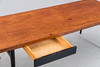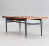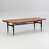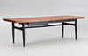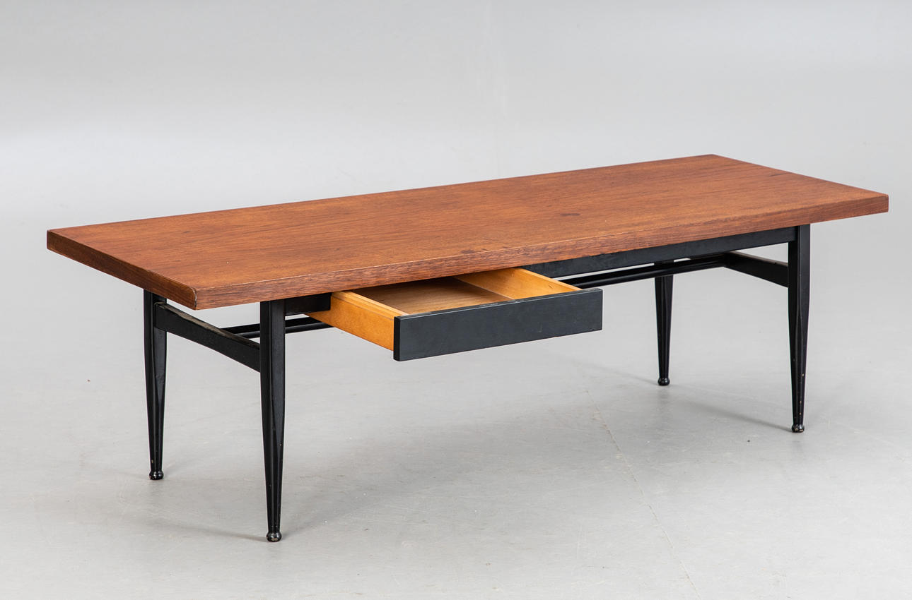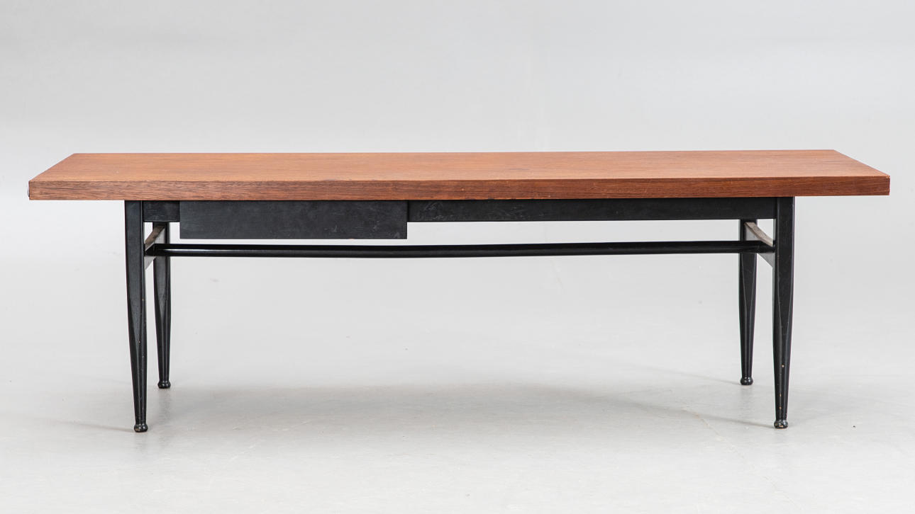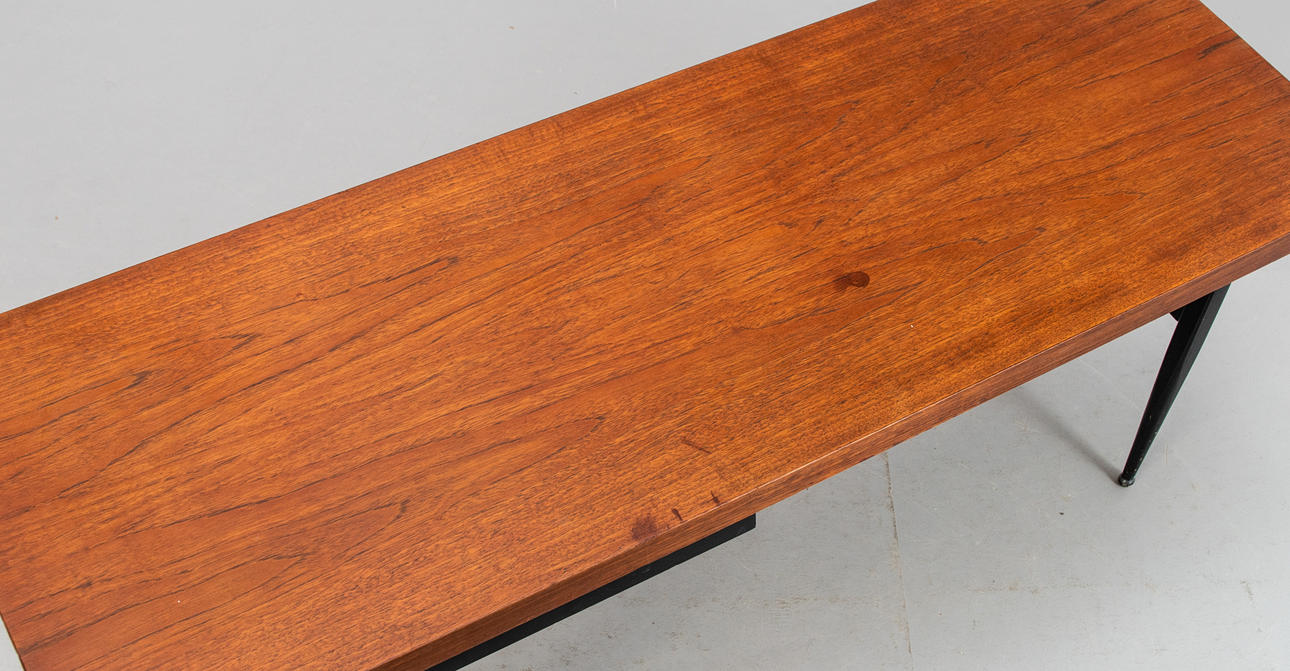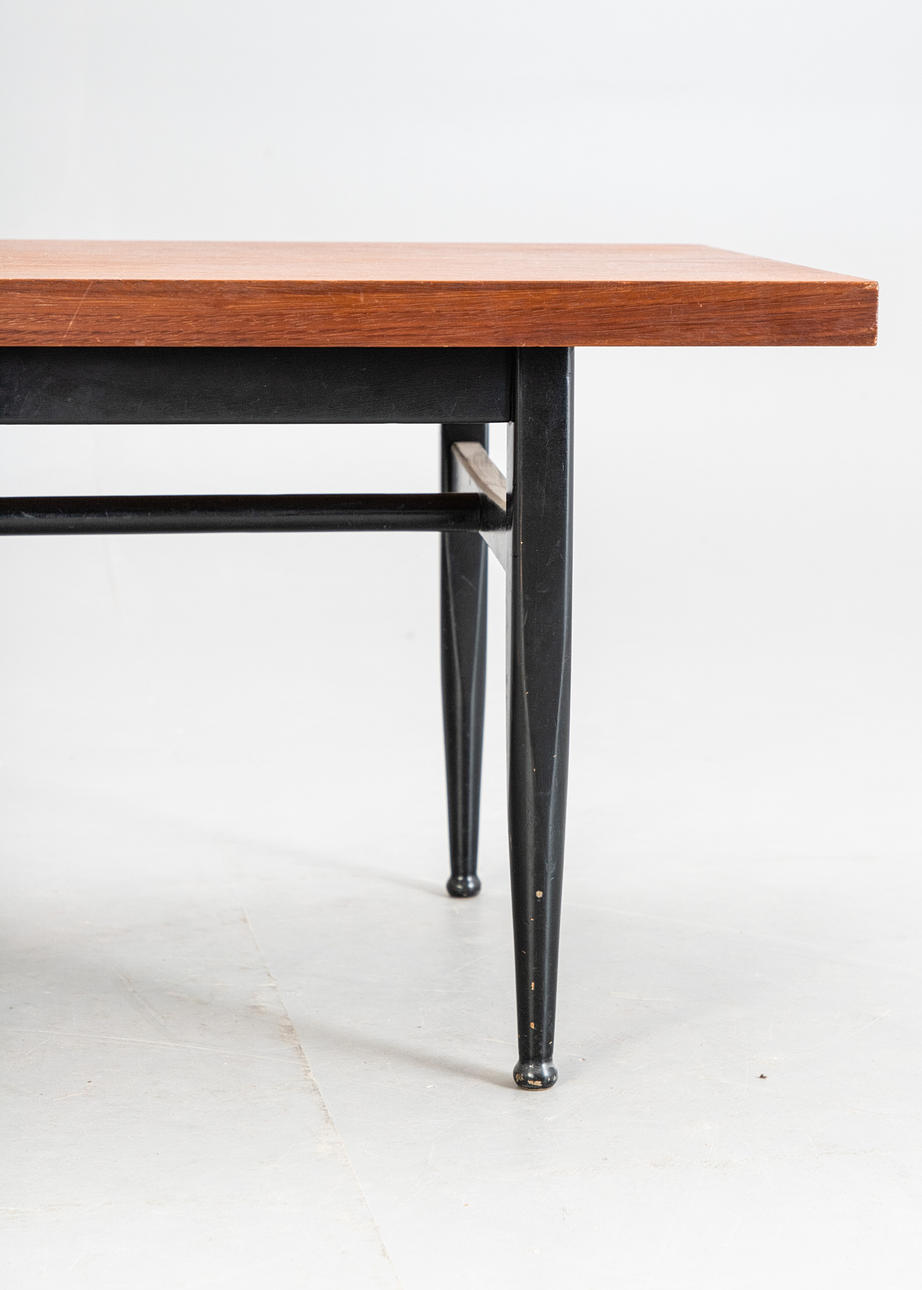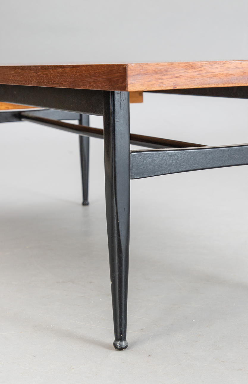 Soffbord/soffbord. Mitten av århundradet design. Fanerad bordsskiva. Massivt trä bas, svartmålad. Det finns en låda under bordsskivan.