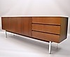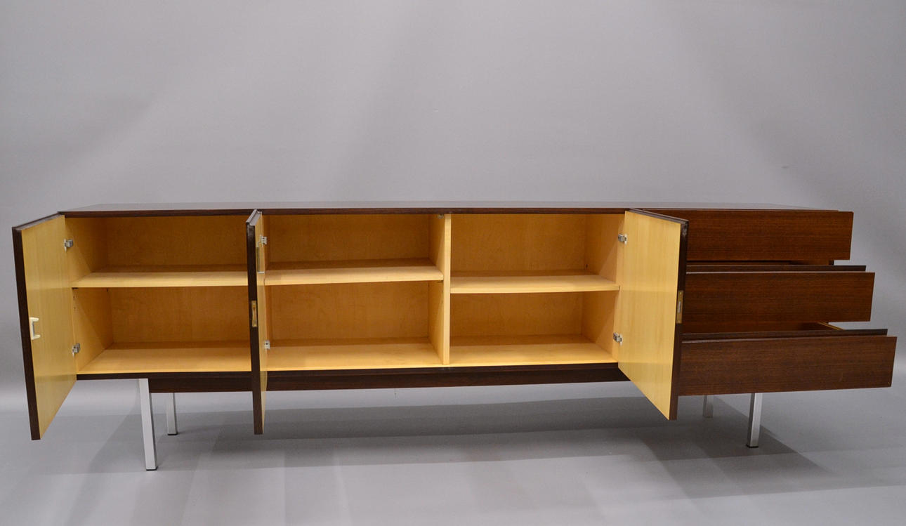 Mörkt träfanér, lönninredning med dörrar och lådor.