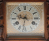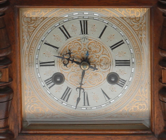 Junghans. Valnöt. Slipat glas samt dekor med fackla och koger. Nyckel finns. Total höjd med konsolhylla 67 cm.